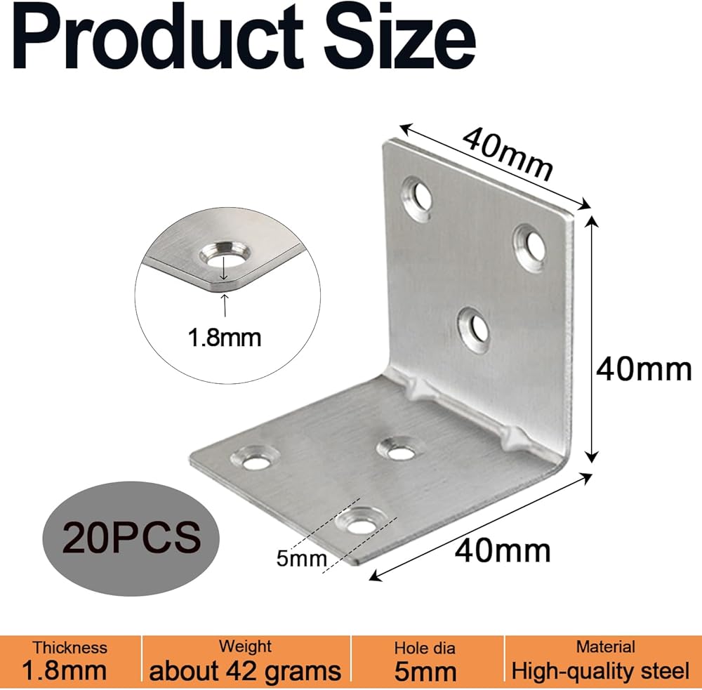 【أقواس زاوية بحجم مثالي】 تحتوي كل مجموعة على 20 قطعة من دعامات الزوايا المعدنية، بقياس 1.5 بوصة × 1.5 بوصة × 1.5 بوصة (50 مم × 50 مم × 50 مم) بسمك 2.0 مم. تأتي كل دعامة زاوية مع 6 فتحات مثقوبة مسبقًا مقاس 5 مم للتركيب المرن والدعم القوي عبر مجموعة واسعة من التطبيقات