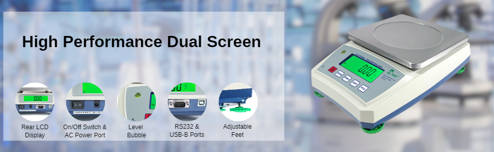 يتمتع HRB-XG 10001 بقدرة وزن عالية تصل إلى 10 كجم بدقة 0.1 جرام لضمان الدقة والدقة. يتميز هذا الميزان بفقاعة مستوى مدمجة، وأقدام قابلة للتعديل، ومؤشر للخطأ، وقدرة معايرة خارجية. يحتوي HRB-XG على شاشة LED مزدوجة أمامية وخلفية وسهلة القراءة وعالية الوضوح.