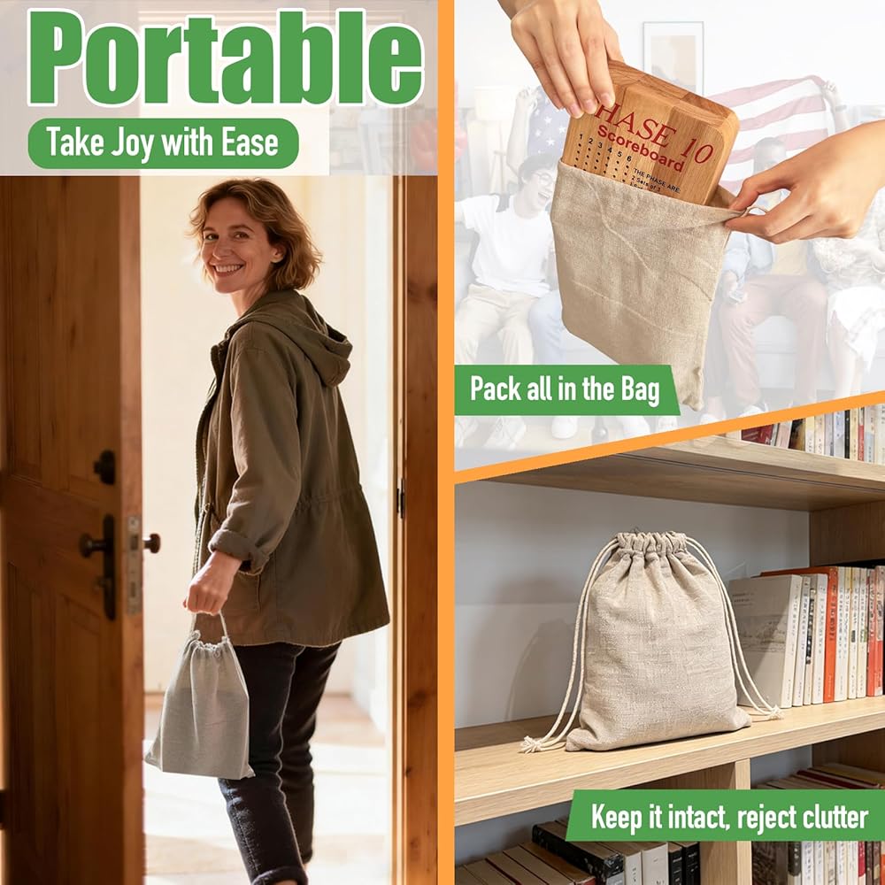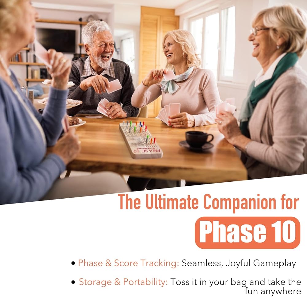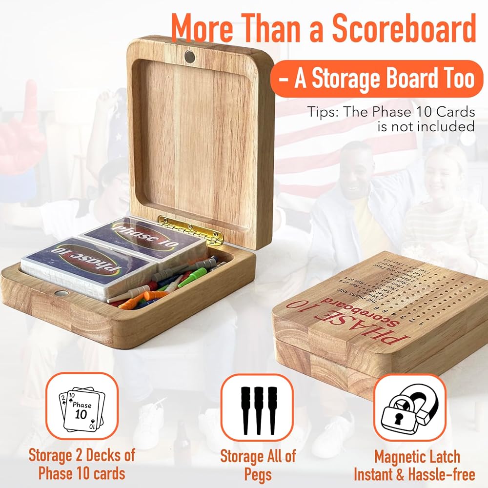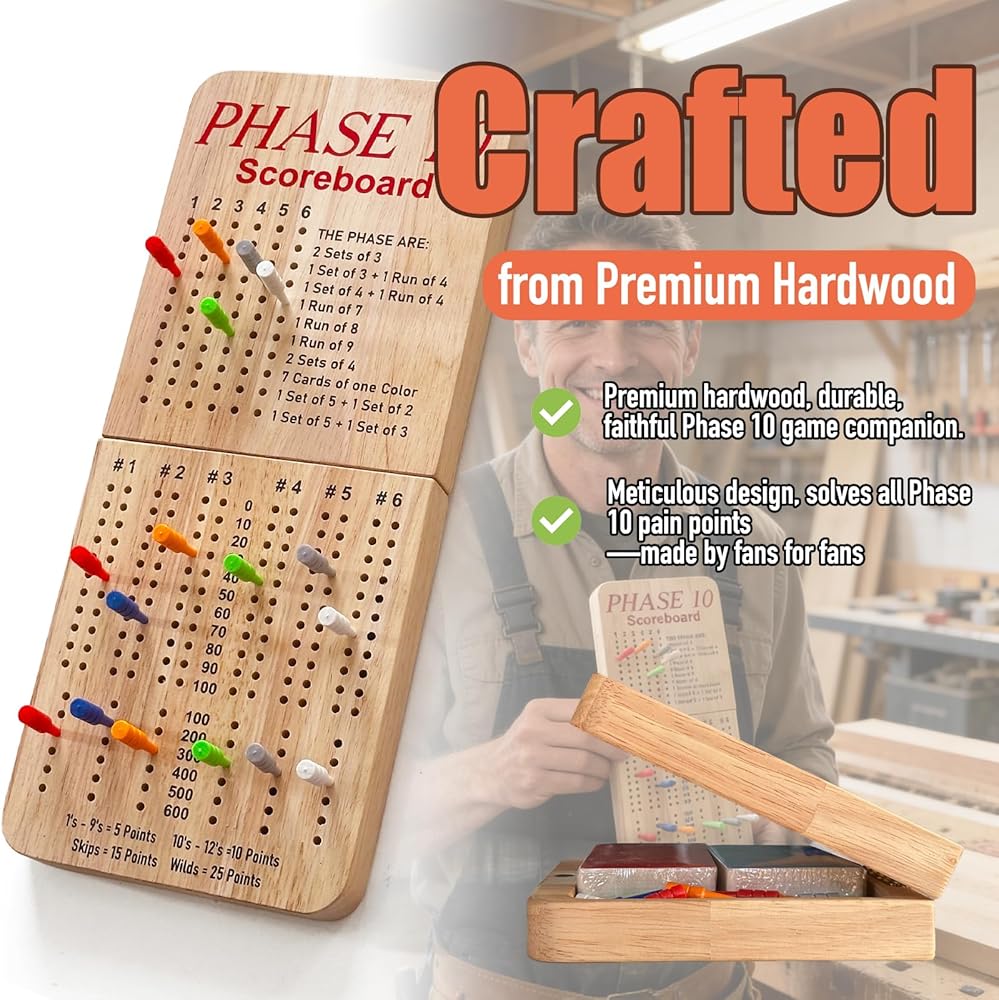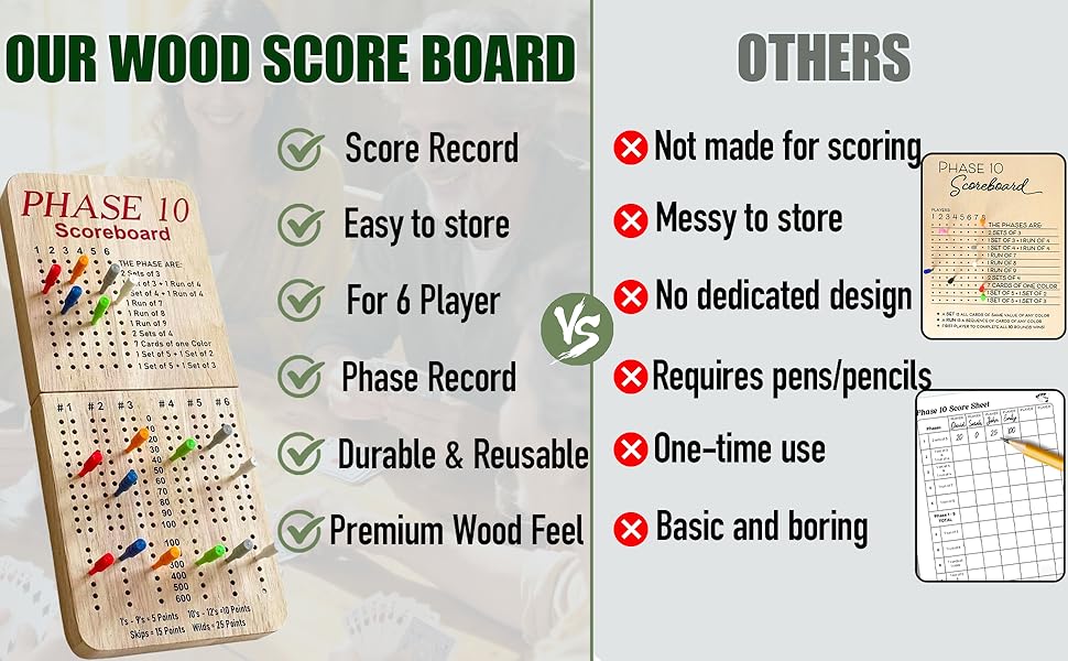 • Score Board for Phase 10, Thicken Real Quailty Hardwood Oak Scoreboard with 6 Colored Pegs Wooden Score Sheets Tracker Board Party Family Night Oak Accessories Board