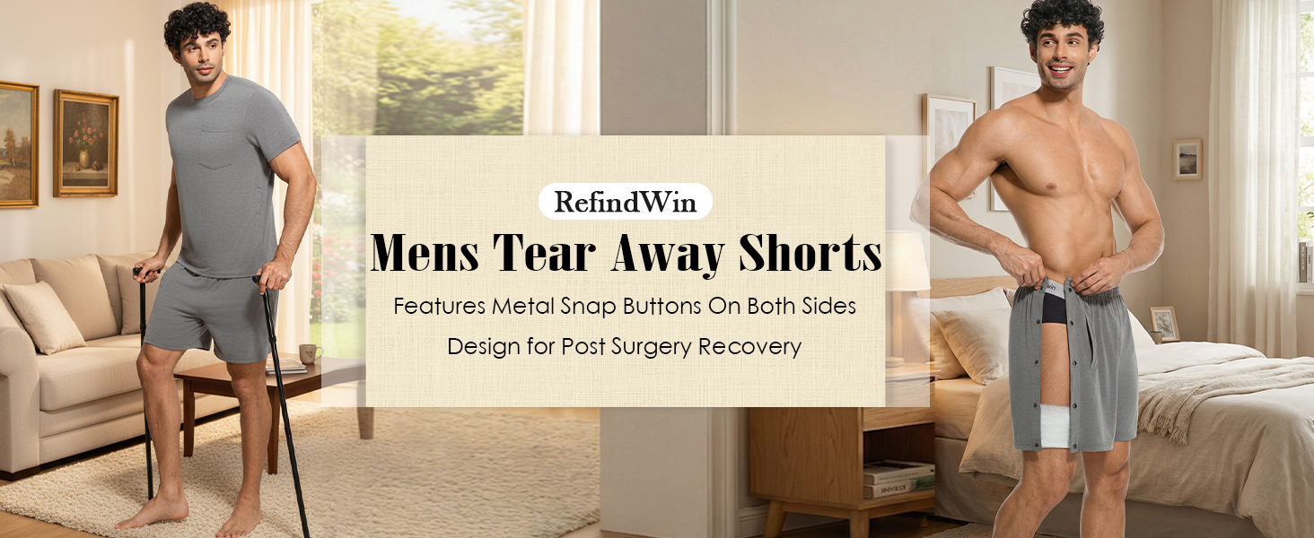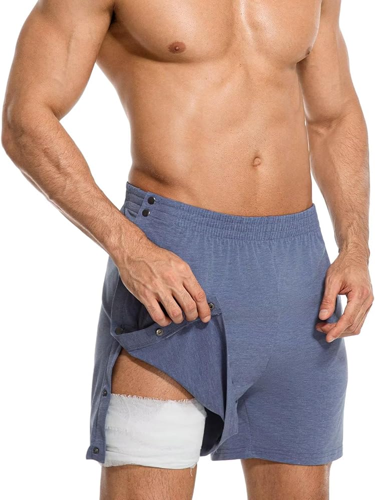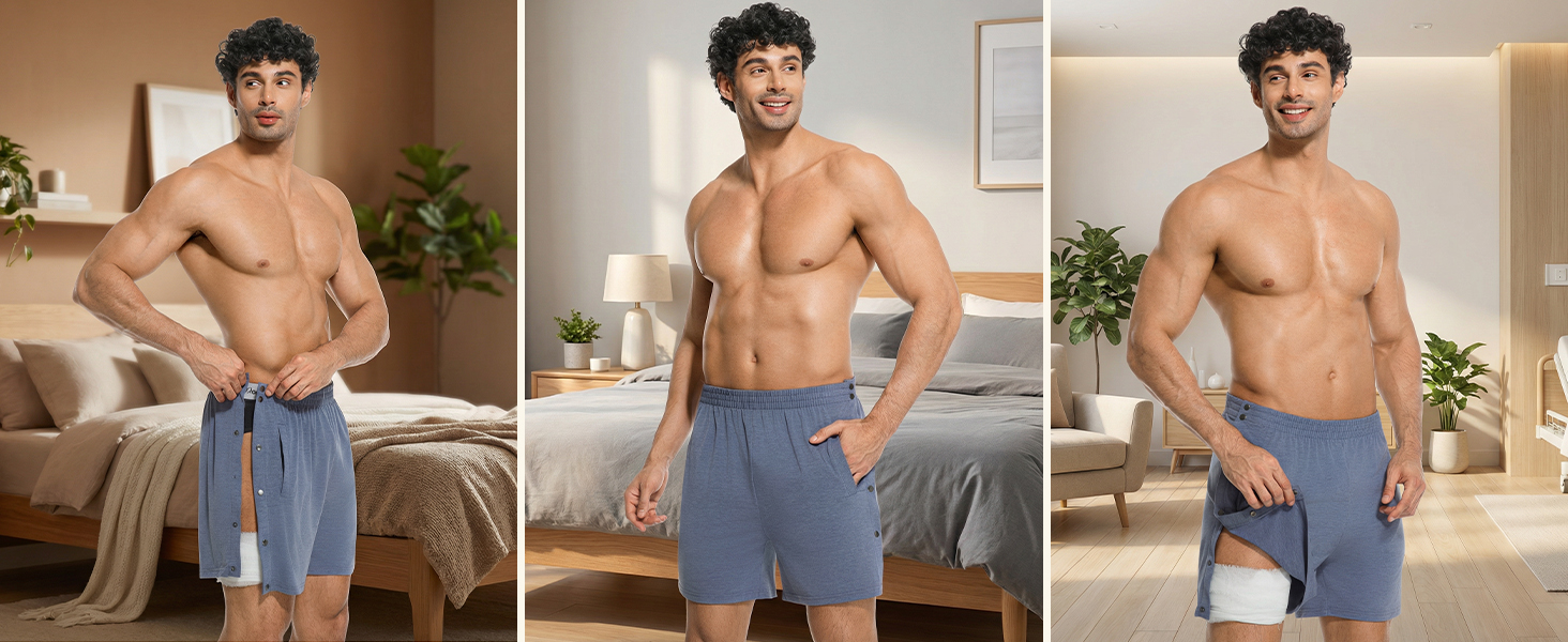 سهل الارتداء والخلع - يمكن إزالة السراويل القصيرة للرجال للتعافي بعد العمليات الجراحية بالكامل من أجل ارتداء الملابس وخلعها بسهولة، مما يسهل المساعدة في الرعاية الصحية مع تحقيق التوازن بين الراحة والعملية.