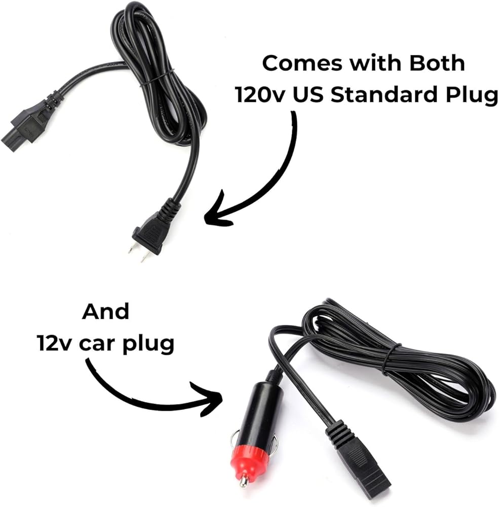 يتم توصيله بولاعة سجائر السيارة بجهد 12 فولت أو بمنفذ منزلي (محول تيار متردد/تيار مستمر مدمج) يتضمن كلا السلكين، وهو مبرد محمول بجهد 12 فولت تيار مستمر/110 فولت تيار متردد. يعمل كمبرد صغير للسيارة عند الحاجة!