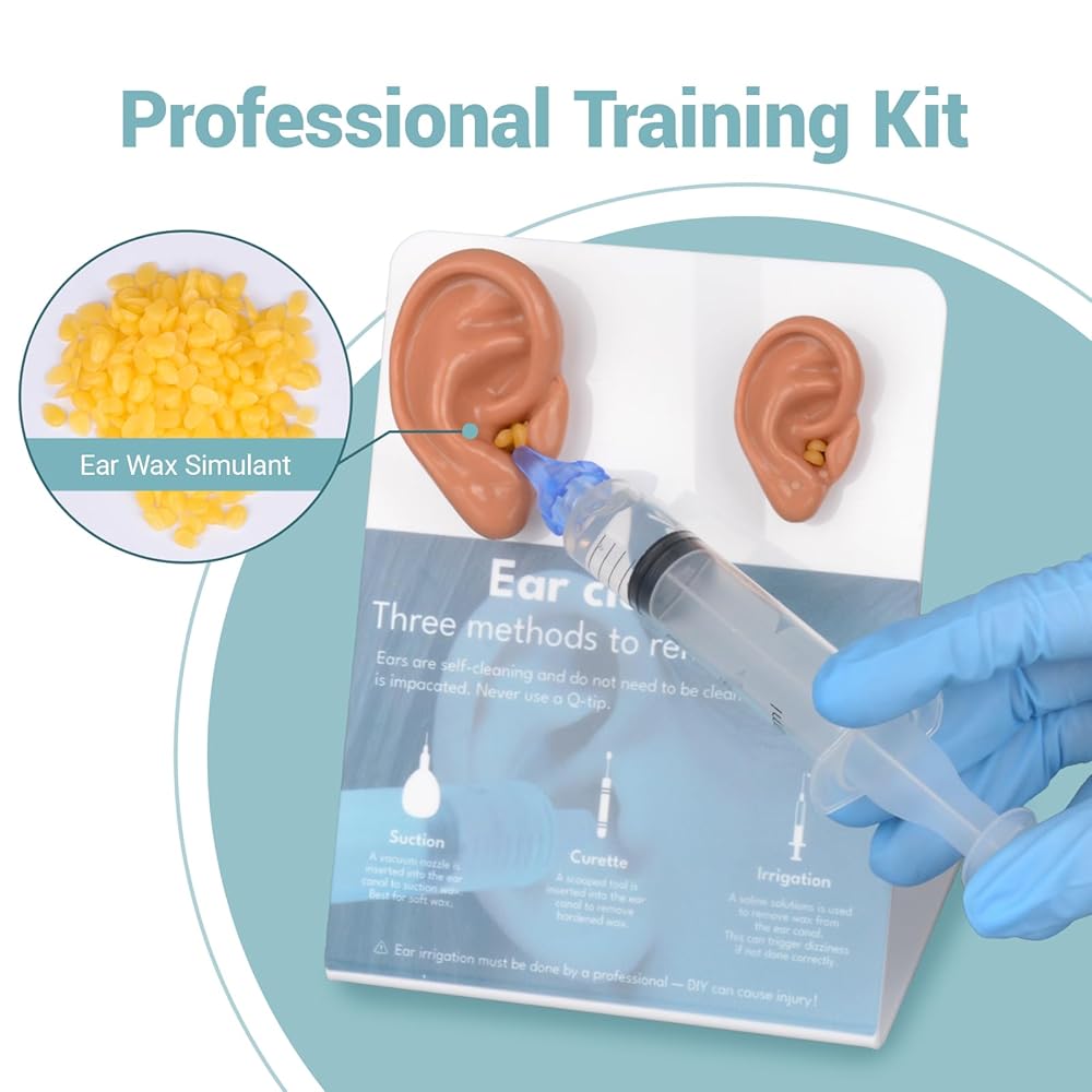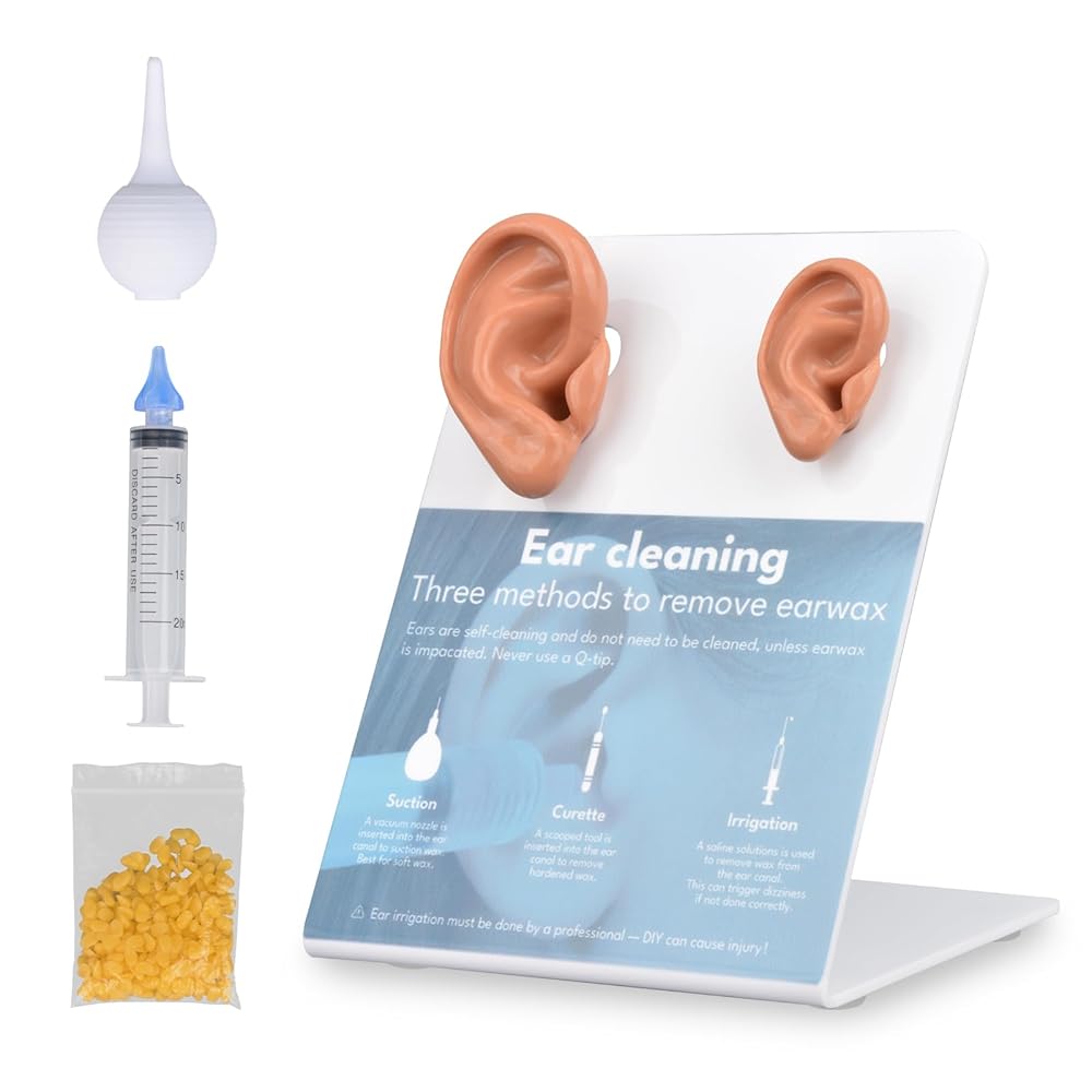 • مجموعة نموذجين كاملة: تشتمل على نماذج أذن للبالغين والأطفال للتدريب على تقنيات متنوعة، بالإضافة إلى جهاز ري على شكل حقنة ومصباح تجفيف لممارسة إزالة شمع الأذن.