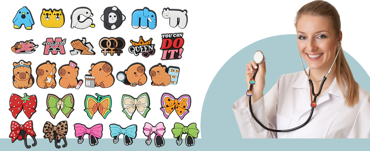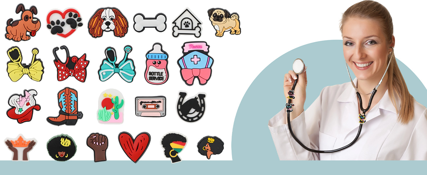 تصميمات لطيفة ذات طابع طبي: تتضمن 25 قطعة سحرية لسماعة الطبيب تتميز برموز كلاسيكية، مثالية لأطباء الأطفال، وممرضات الطوارئ، وتقنيات الطبيب البيطري، ومحترفي الرعاية الصحية الذين يرغبون في إظهار شغفهم بالأناقة
