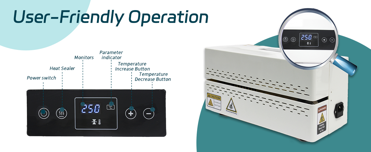 هيكل إغلاق مبتكر: يتميز بآلية إغلاق متقدمة مع التحكم الرقمي في درجة الحرارة، مما يضمن إحكام الغلق على الأكياس البلاستيكية والبوليستر. مثالية لتخزين المواد الغذائية والوجبات الخفيفة وتطبيقات التعبئة والتغليف.