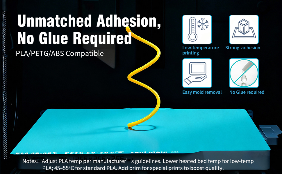 دليل درجة الحرارة: يطابق بدقة احتياجات درجة حرارة الشعيرات المختلفة من أجل طباعة فعالة يمكن التحكم فيها: خيوط حرير PLA ذات درجة الحرارة المنخفضة تحقق التصاق ثابت عند 30-50 درجة مئوية؛ PLA العادي: 45-55 درجة مئوية (موصى به)؛ PETG: 50-70 درجة مئوية (70 درجة مئوية الأمثل)؛ ABS: 90-120 درجة مئوية، مع خرج ثابت مدعوم بمقاومة PEI الممتازة لدرجات الحرارة العالية. بالمقارنة مع ألواح PEI العادية ذات الوجهين (PLA: 55-65 درجة مئوية)، يتمتع هذا المنتج بنطاق درجة حرارة أقل والتصاق أقوى. (ملاحظة: يتم اختبار درجات الحرارة أعلاه على طابعات ثلاثية الأبعاد مغلقة ذات خيوط قياسية. بالنسبة للطابعات غير المغلقة، قم برفع درجة الحرارة بشكل صحيح؛ إذا كانت درجة حرارة الغرفة ≥10 درجة مئوية، فاضبط PLA العادي إلى أكثر من 55 درجة مئوية لتعزيز الالتصاق.)