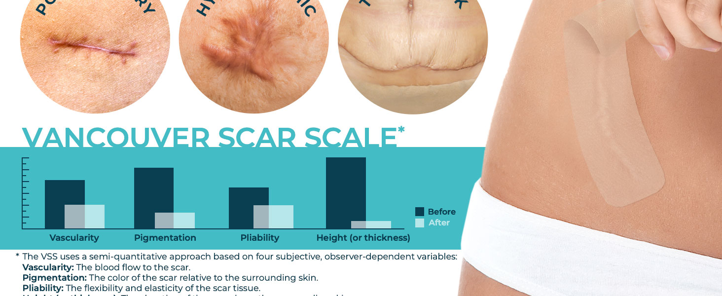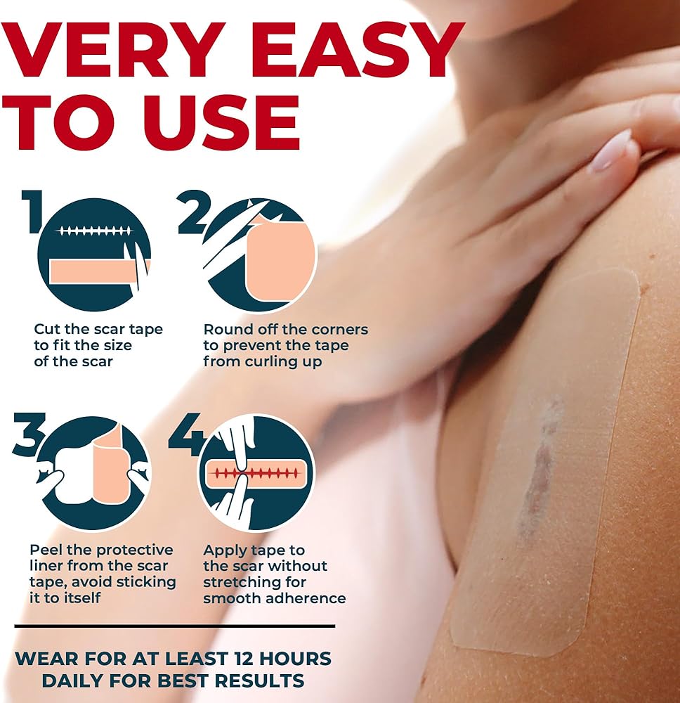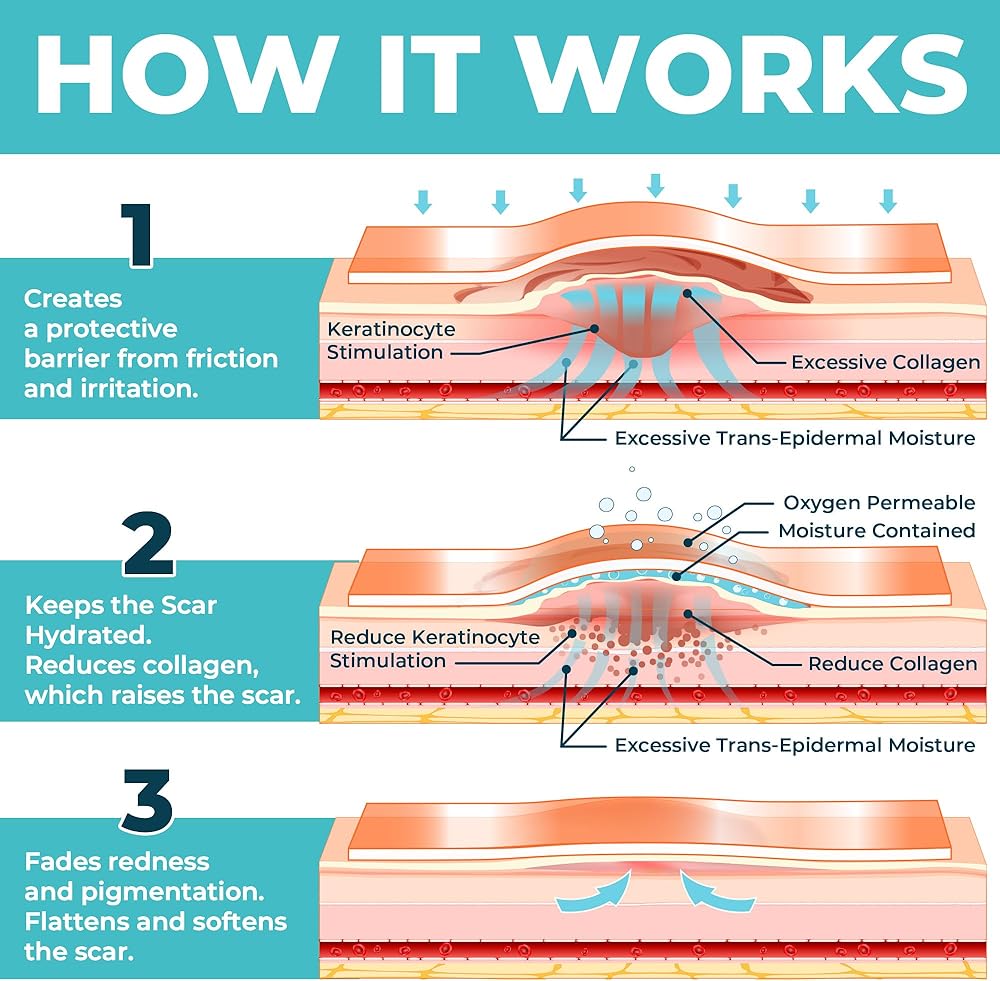 التصاق قوي وطويل الأمد - تلتصق رقع السيليكون الخاصة بنا للندبات بشكل آمن وتبقى ثابتة طوال النهار أو الليل. يعتبر اللاصق القوي المضاد للحساسية آمنًا لجميع الأعمار ويسمح لشرائط الندبات المصنوعة من السيليكون المقاومة للماء بتحمل الحركة المكثفة والاستحمام اليومي دون تجعيد أو تقشير تحت الملابس.