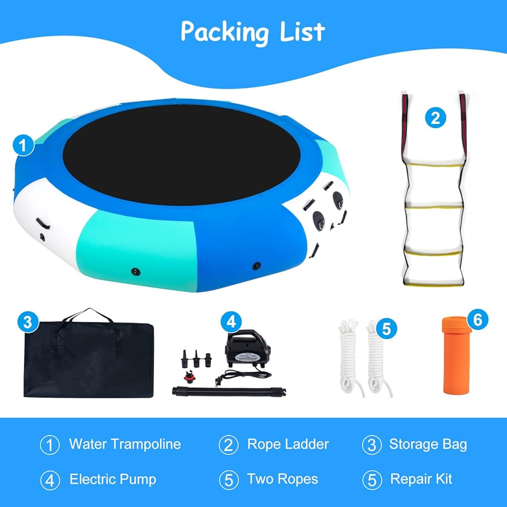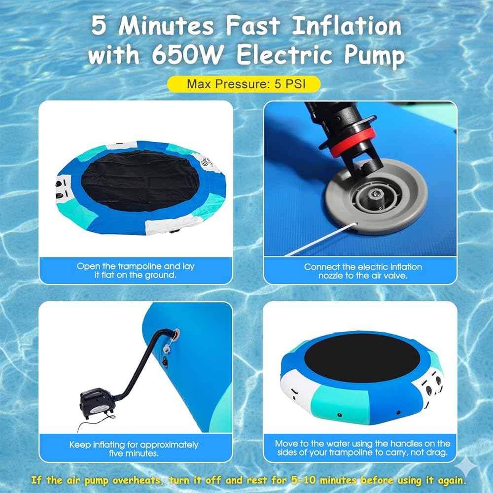 【نفخ سريع خلال 5 دقائق】 ترامبولين الماء القابل للنفخ مجهز بمضخة هواء كهربائية قوية. يستغرق نفخ الترامبولين 5 دقائق فقط، مما يسمح لك بالاستمتاع بالقفز والرش في وقت قصير!