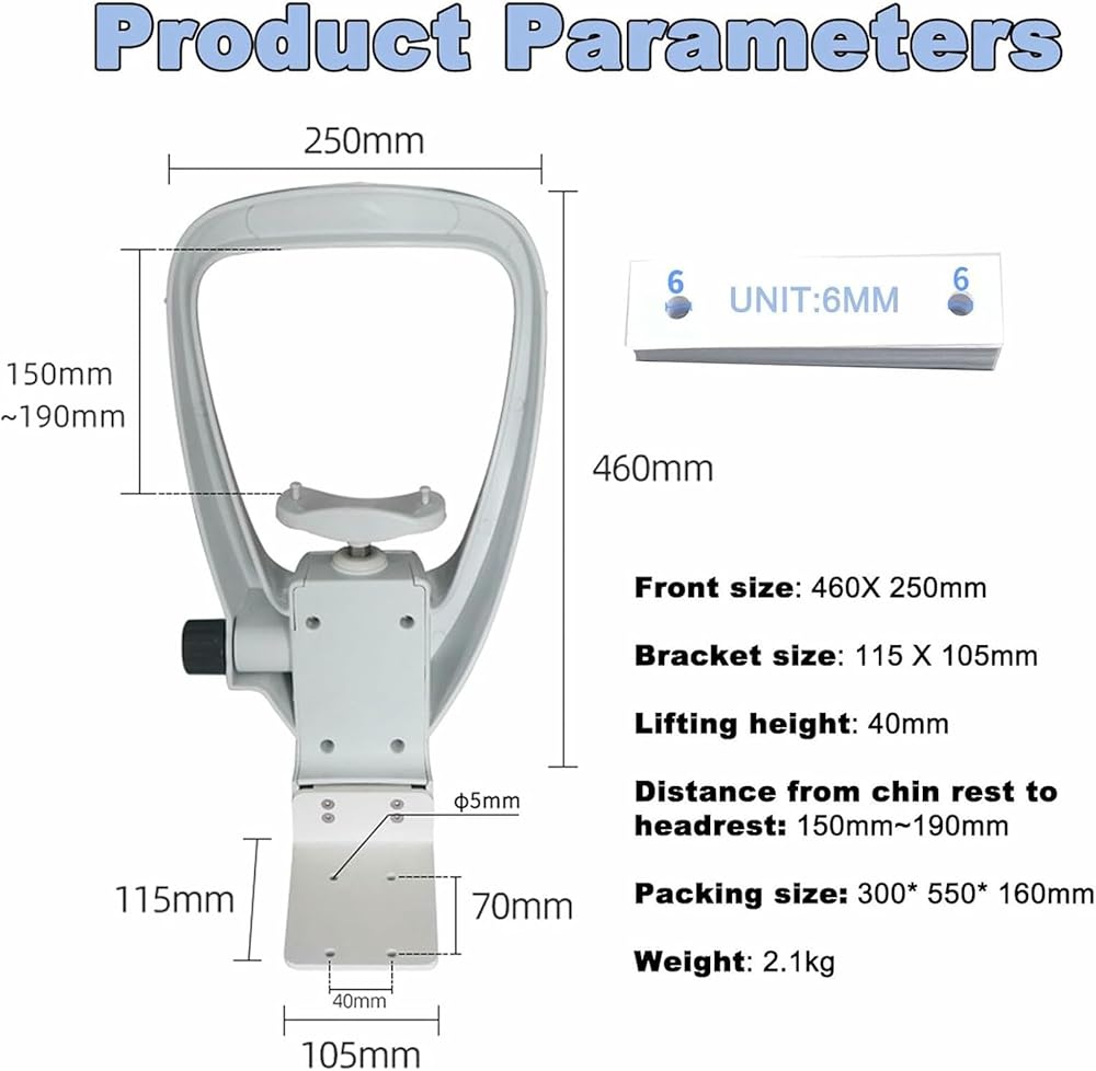 【Product Dimensions】: Front size of the tray is 460 x 250 mm, and the stand size is 115 x 105 mm. The lifting height is 40 mm, and the distance between the chin rest and headrest is adjustable from 150 mm to 190 mm. The product weighs 2.1 kg.