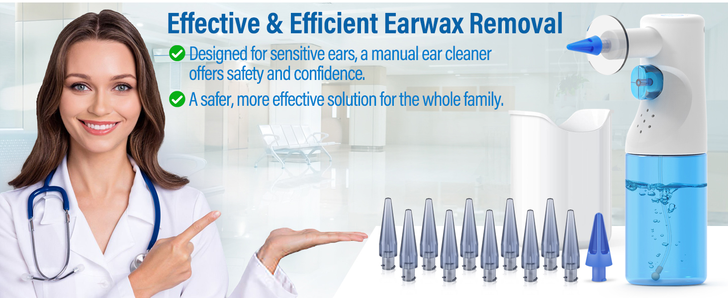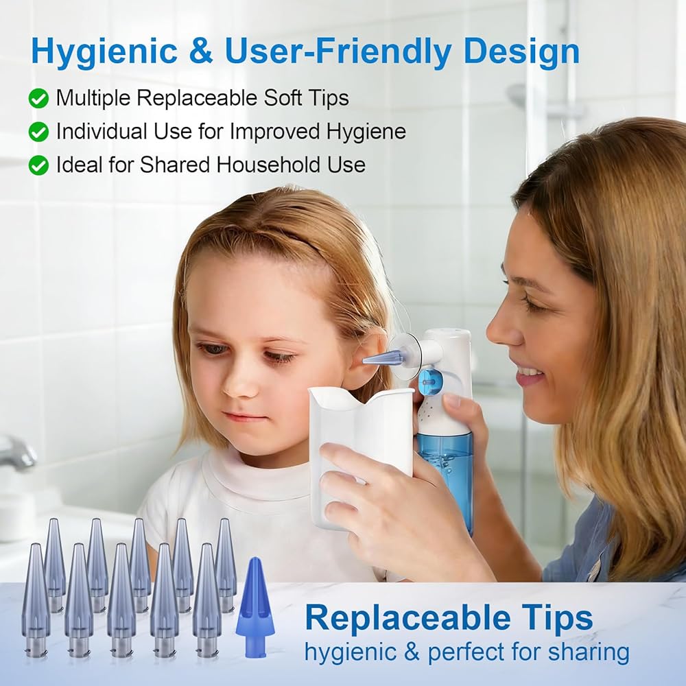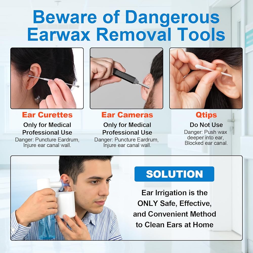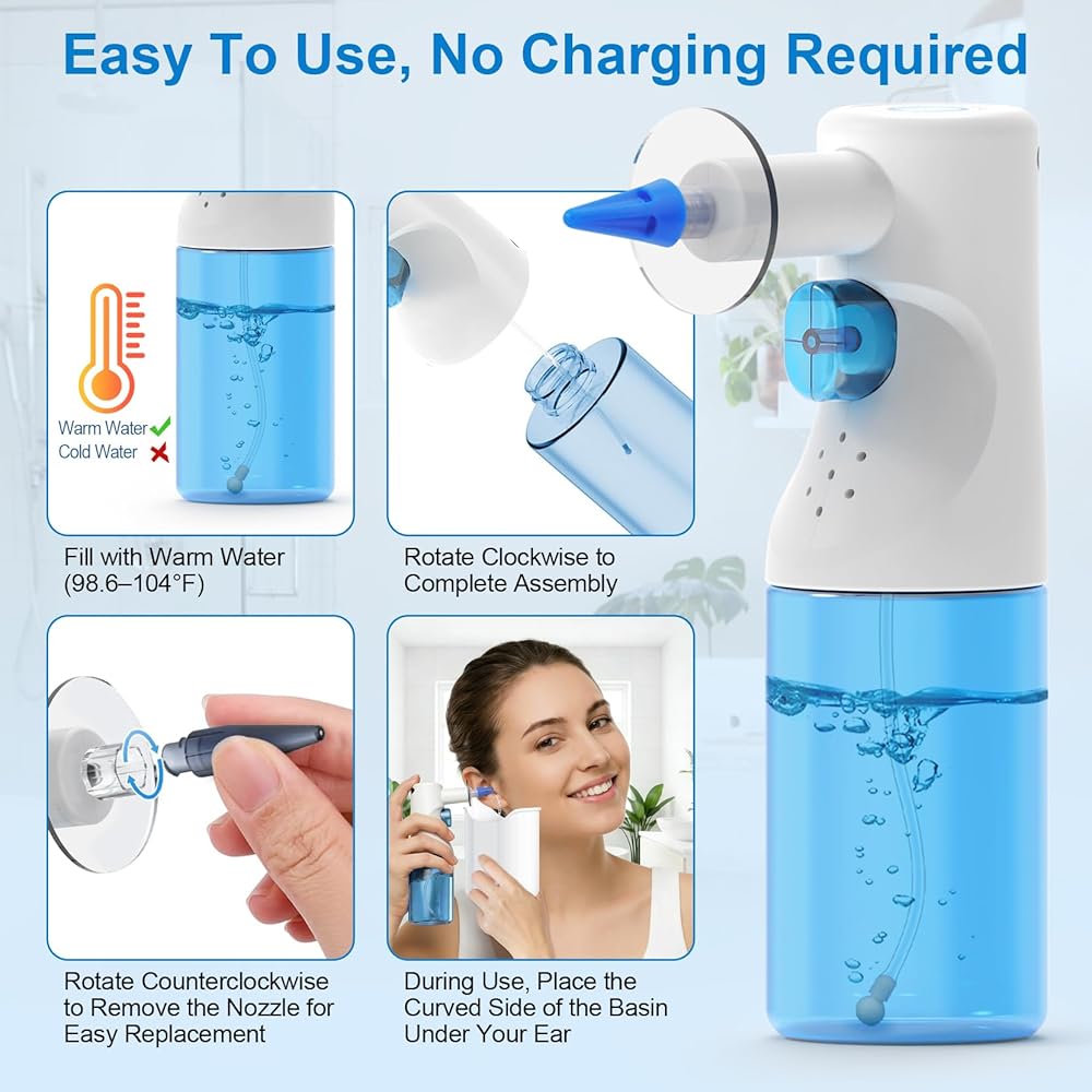 تخفيف سريع من انسداد الأذنين والشمع المتراكم: تم تصميم هذا النظام كحل كامل لإزالة شمع الأذن لتنظيف الأذن، ويساعد على توفير راحة ملحوظة من الضغط والسمع المكتوم الناجم عن احتياجات إزالة شمع الأذن؛ يدعم تدفق الماء لإزالة شمع الأذن عملية إزالة شمع الأذن الطبيعية والفعالة ويعمل كمجموعة تنظيف شمع الأذن يمكن الاعتماد عليها
