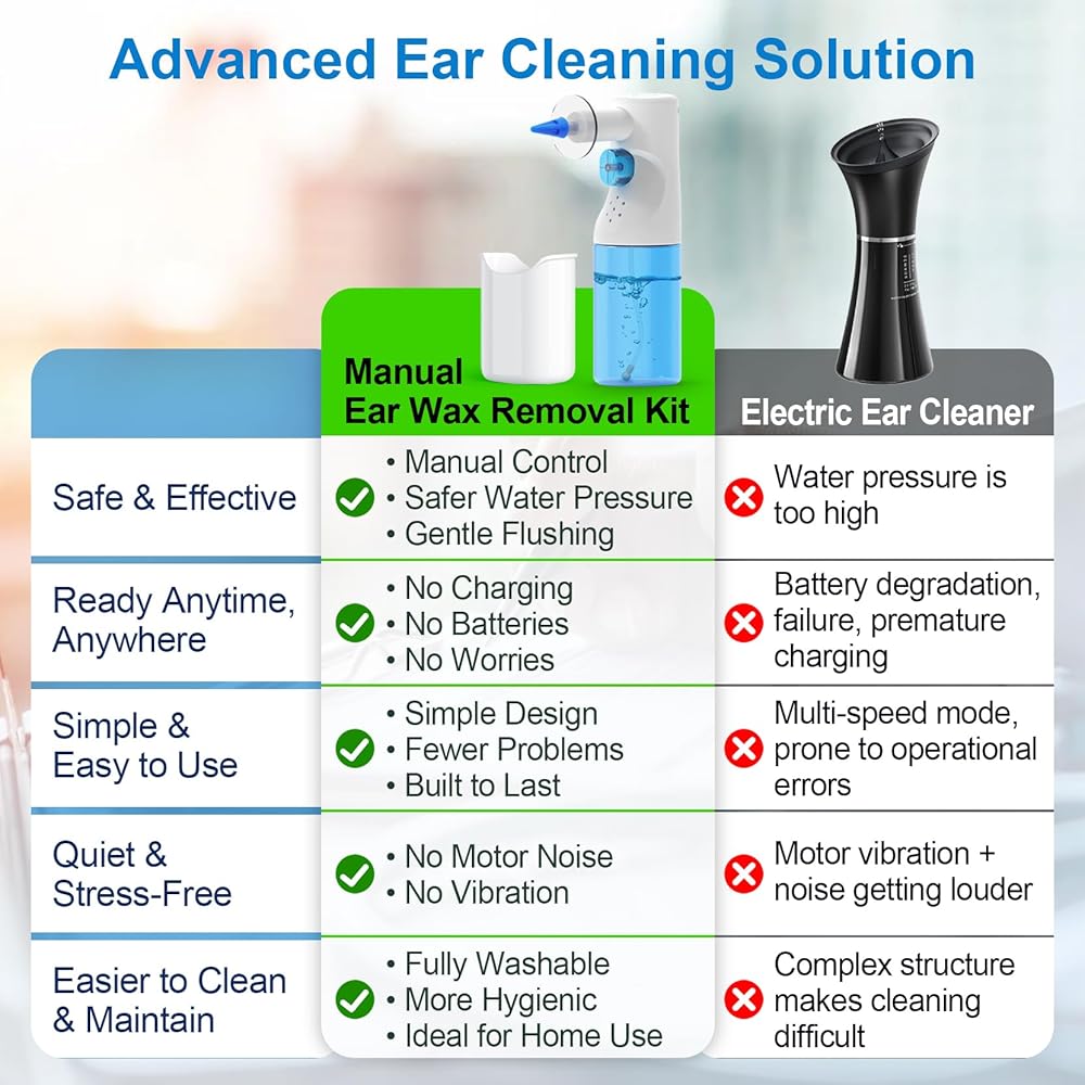 مجموعة تنظيف الأذن الآمنة واللطيفة - العناية بالأذن في المنزل: تم تصميم مجموعة تنظيف الأذن اليدوية هذه لتقليد نظام تنظيف الأذن الشائع الاستخدام في العيادات؛ باستخدام تيار الماء الذي يتم التحكم فيه يدويًا، يعمل كمجموعة فعالة لإزالة شمع الأذن لإزالة شمع الأذن المتراكم بلطف في المنزل، مما يساعد على الحفاظ على الأذنين نظيفة كجزء من التنظيف اليومي للأذن.