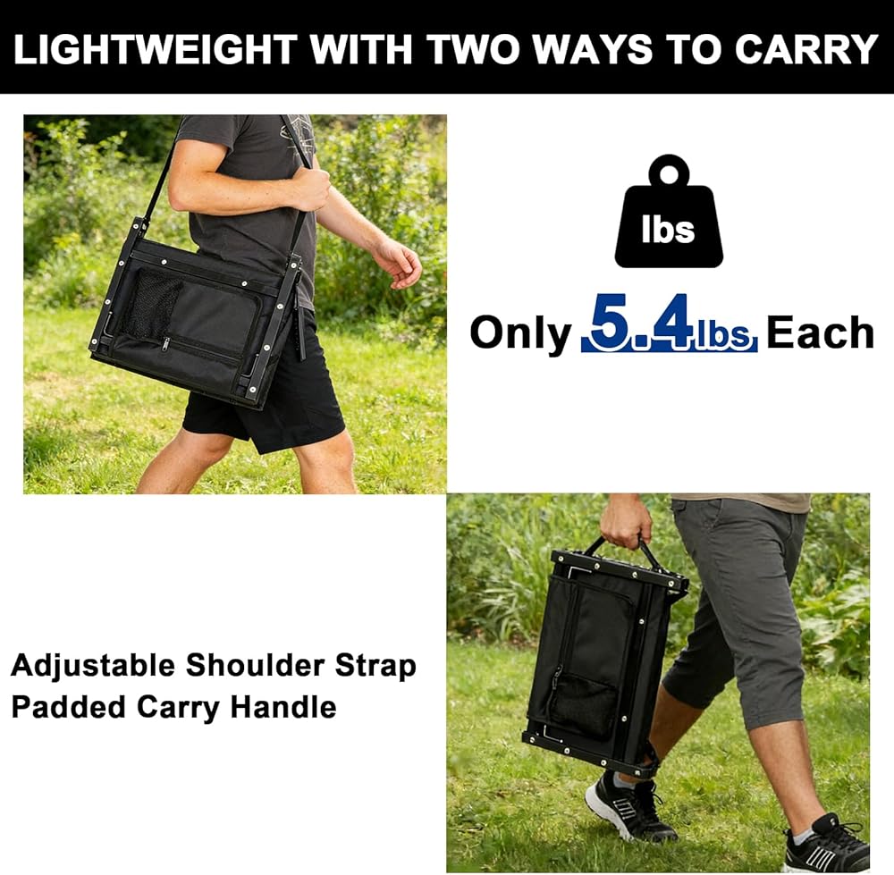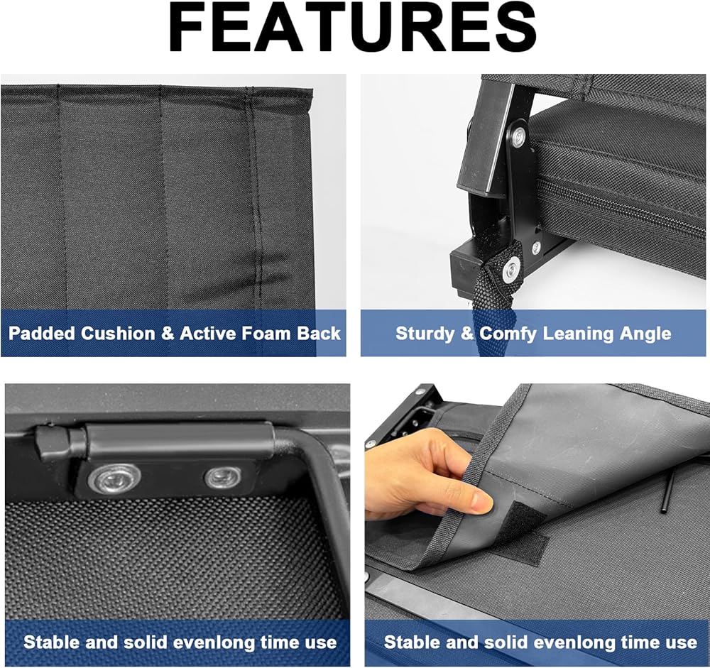 خفيف الوزن للغاية - 5.4 رطل فقط، يزن كل مقعد في الملعب 5.4 رطل فقط، مما يجعل من السهل حمله في ألعاب كرة القدم، والمناسبات الرياضية، ورحلات التخييم، والحفلات الموسيقية الخارجية. حزام الكتف القابل للتعديل والتصميم القابل للطي يجعل النقل بسيطًا ومريحًا.