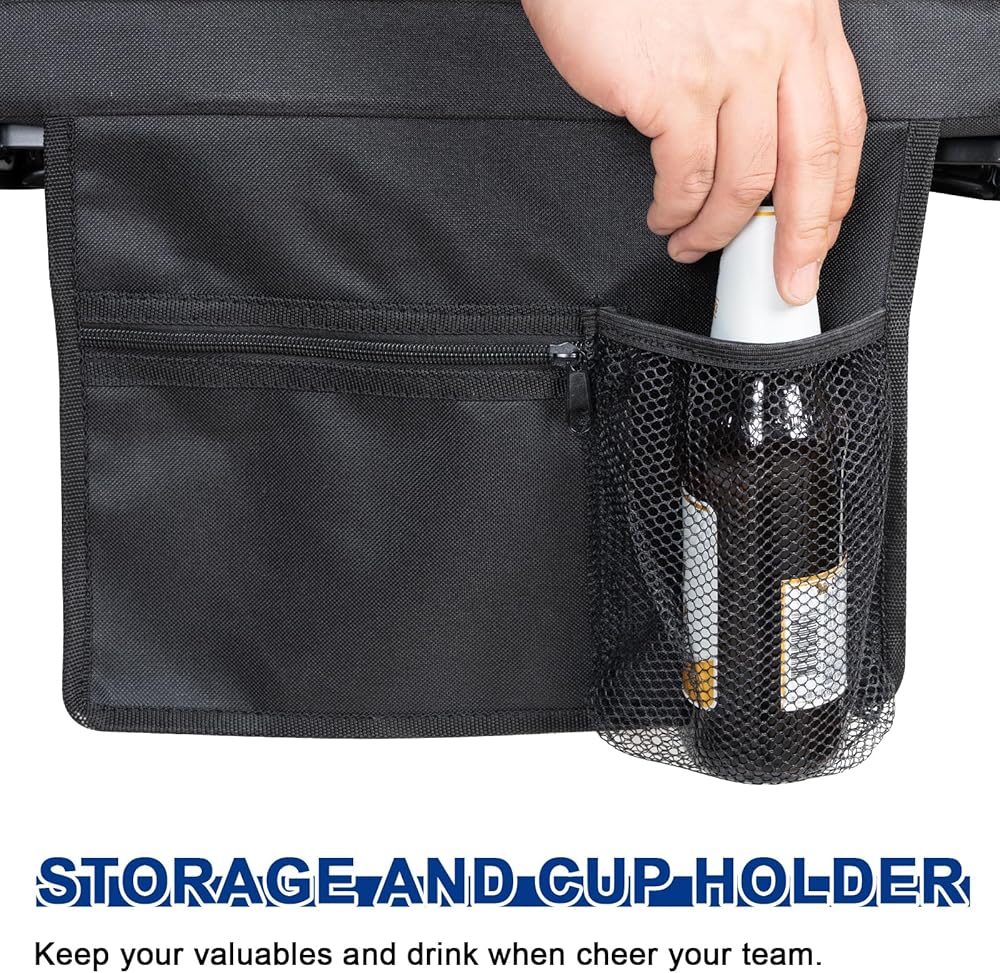 تخزين مريح وحامل أكواب، يتميز كل مقعد في الملعب بجيب تخزين بسحاب وحامل أكواب شبكي حتى تتمكن من الاحتفاظ بالمشروبات والهواتف والأشياء الصغيرة في متناول اليد أثناء الاستمتاع باللعبة أو الأنشطة الخارجية.
