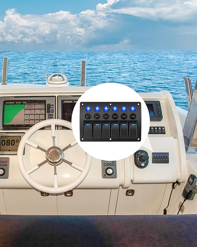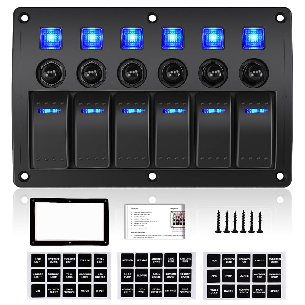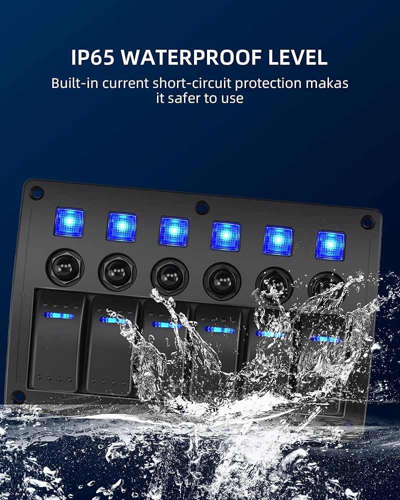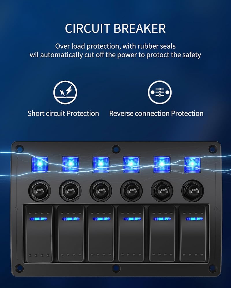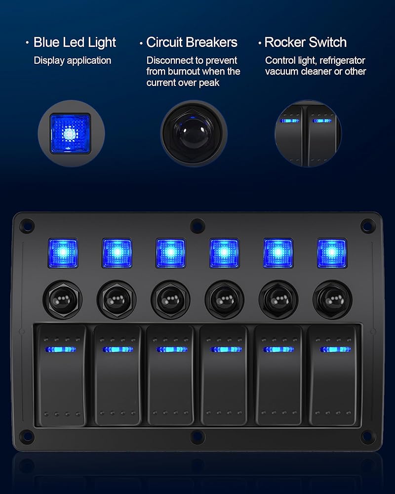 【لوحة مفاتيح متعددة الوظائف】: تتضمن 6 ساحرات مع حلقة مطاطية غير منفذة وغطاء مقاوم للماء ومفتاح هزاز LED أزرق، 6 قواطع دوائر، مناسبة لجميع أنواع التحكم في الدائرة، سيقطع قاطع الدائرة الطاقة تلقائيًا ويحمي سلامة الأجهزة الكهربائية، كل ضوء ومفتاح يستخدم بشكل مستقل.