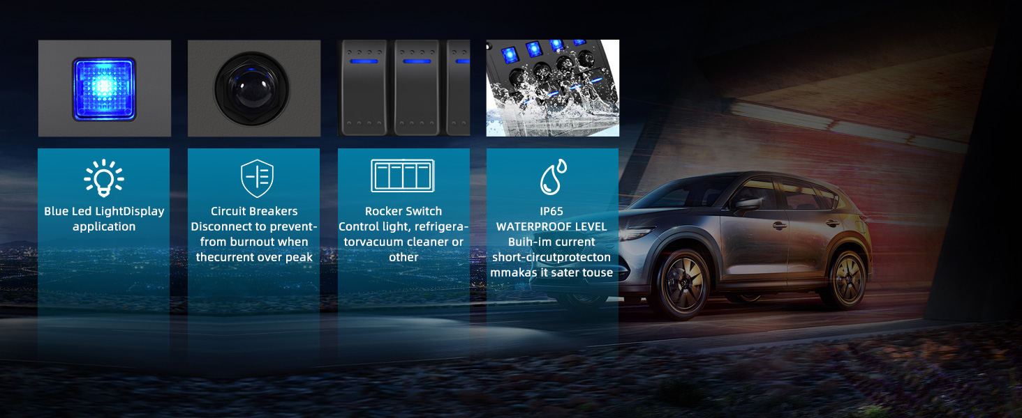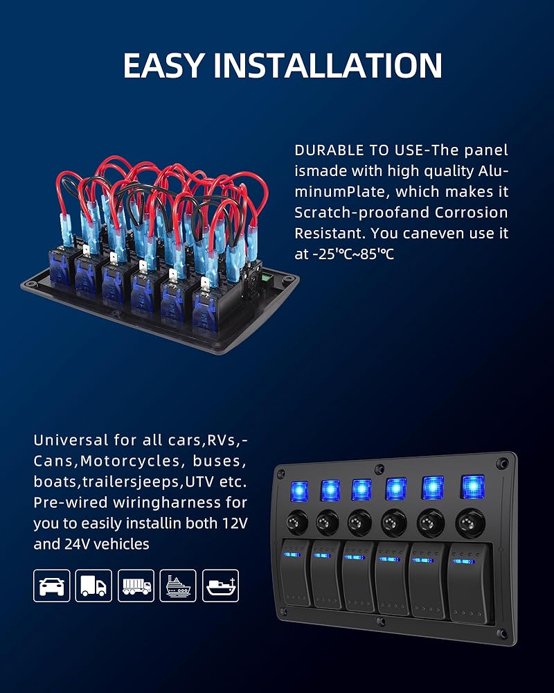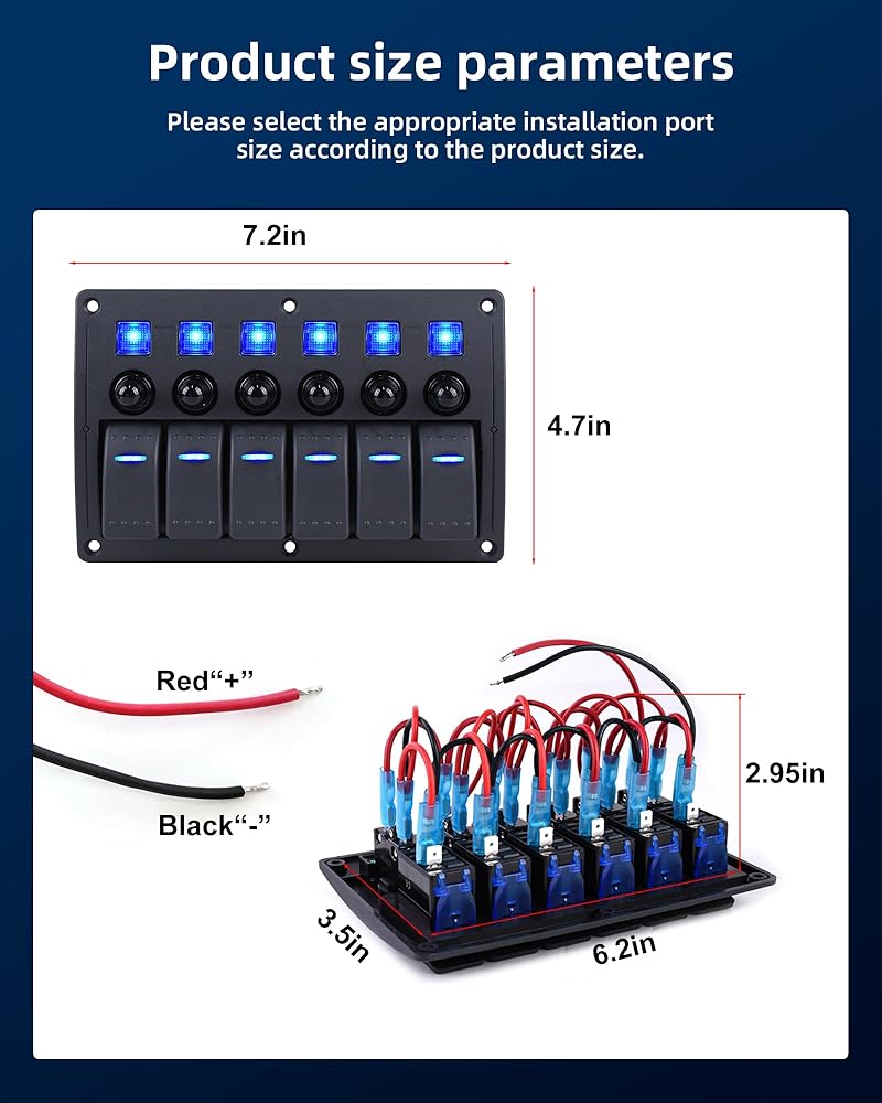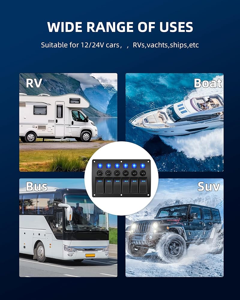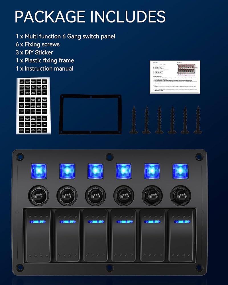 【لوحة مفاتيح متعددة الوظائف】: تتضمن 6 ساحرات مع حلقة مطاطية غير منفذة وغطاء مقاوم للماء ومفتاح هزاز LED أزرق، 6 قواطع دوائر، مناسبة لجميع أنواع التحكم في الدائرة، سيقطع قاطع الدائرة الطاقة تلقائيًا ويحمي سلامة الأجهزة الكهربائية، كل ضوء ومفتاح يستخدم بشكل مستقل.