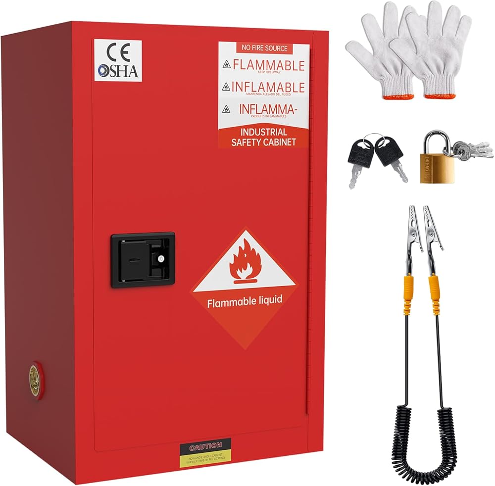 【خزانة تخزين آمنة】 خزانة مقاومة للحريق مقاومة للانفجار، مقاس 35.5 بوصة × 18 بوصة × 18 بوصة، وسعة 25 جالونًا أصفر. تتميز بأخاديد مضادة للتسرب وأنظمة قفل وفتحات للحفاظ على كل شيء آمنًا من الأدوات الصناعية أو المواد القابلة للاشتعال.