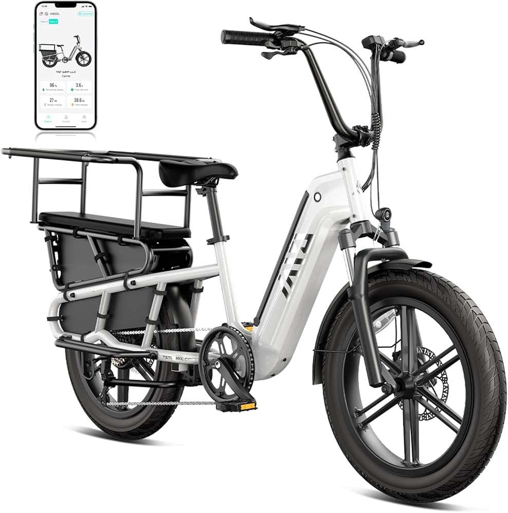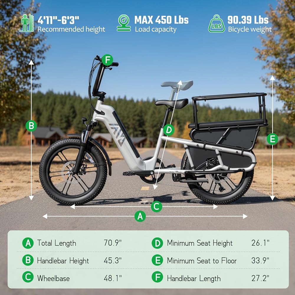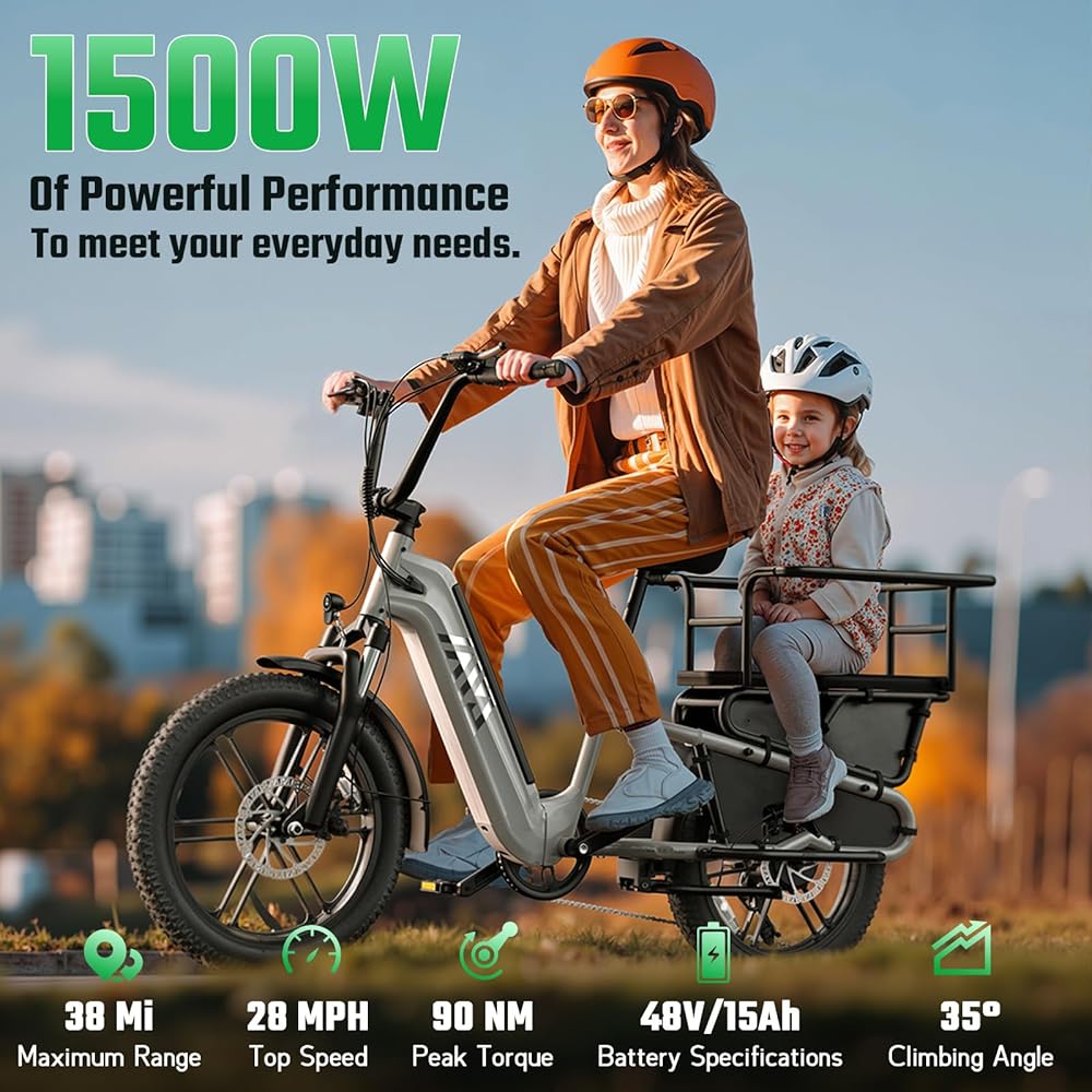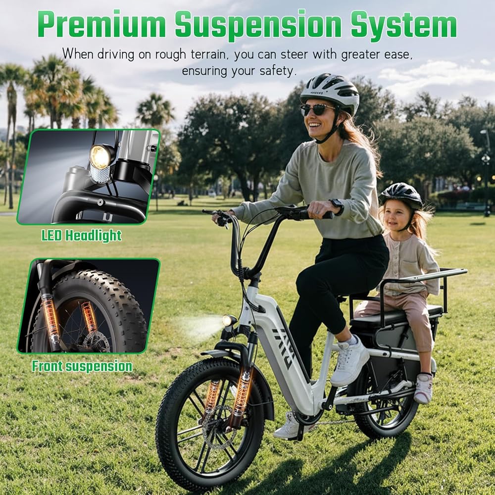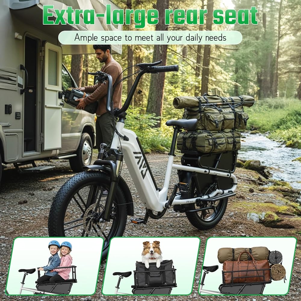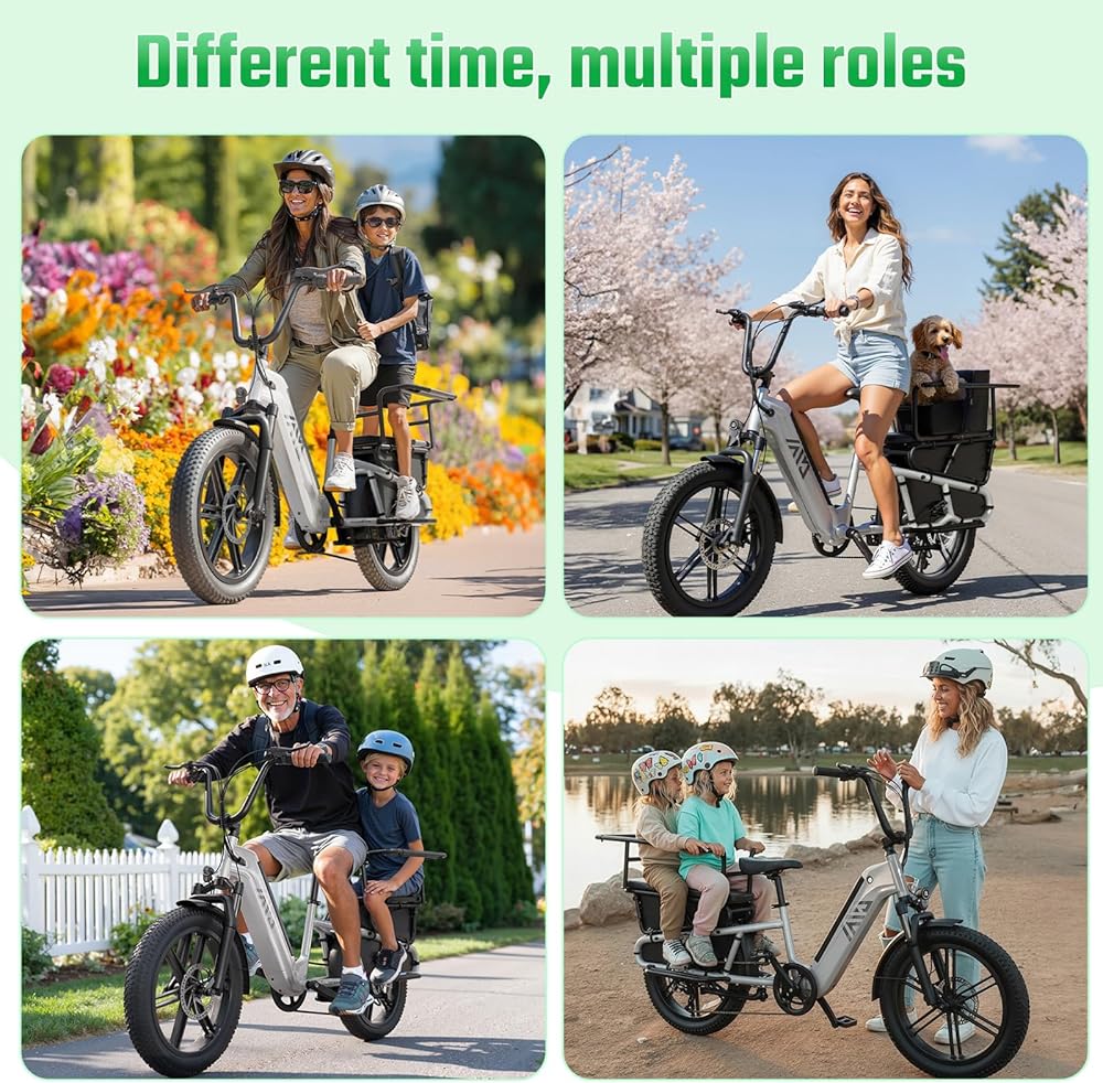 【دراجة كهربائية عائلية متعددة الأغراض】 تم تجهيز دراجة الشحن الإلكترونية الخاصة بنا برف خلفي، ومساند للقدمين، وقضبان حماية، ويمكن استخدام المقعد الخلفي لحمل البضائع وكذلك الأطفال، وجميع التصميمات مخصصة لعائلتك، إنها دراجة إلكترونية عائلية عملية للغاية ومتعددة الوظائف
