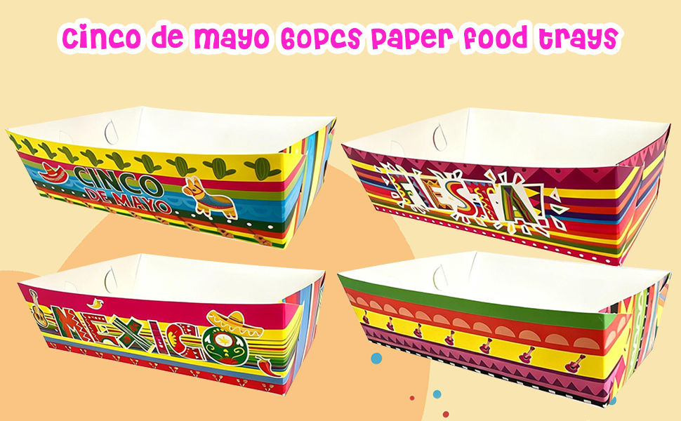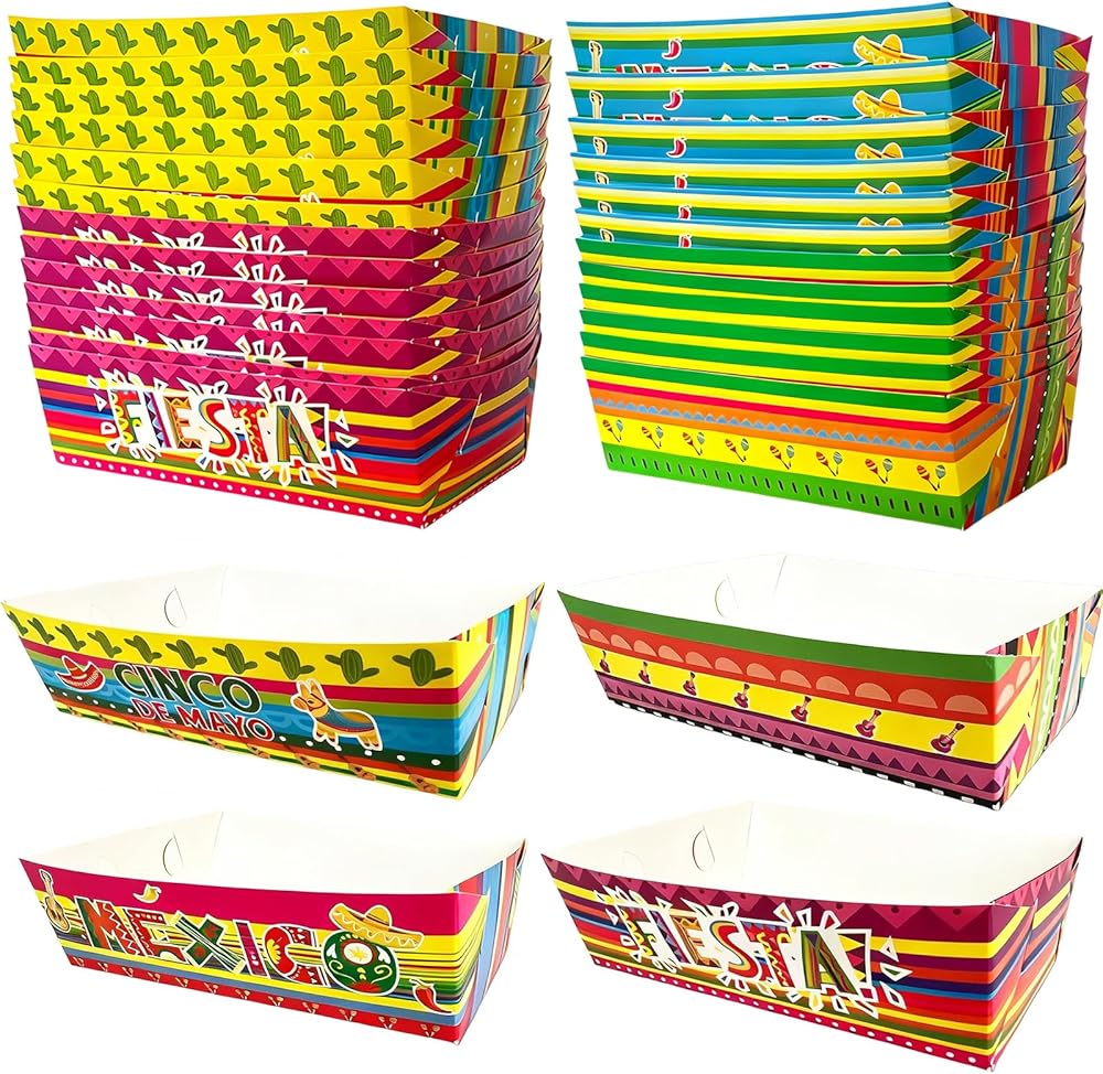 صواني الطعام المكسيكية: تصميمات سينكو دي مايو مناسبة للأجواء المكسيكية. تحتوي صواني الطعام المكسيكية هذه على 4 تصميمات مختلفة. إنها مصنوعة من الورق المقوى عالي الجودة