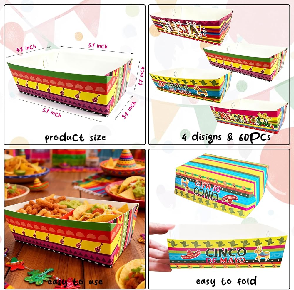 تشتمل على: إجمالي 60 قطعة من صواني الطعام الورقية المكسيكية، 4 تصميمات، 15 قطعة لكل منها