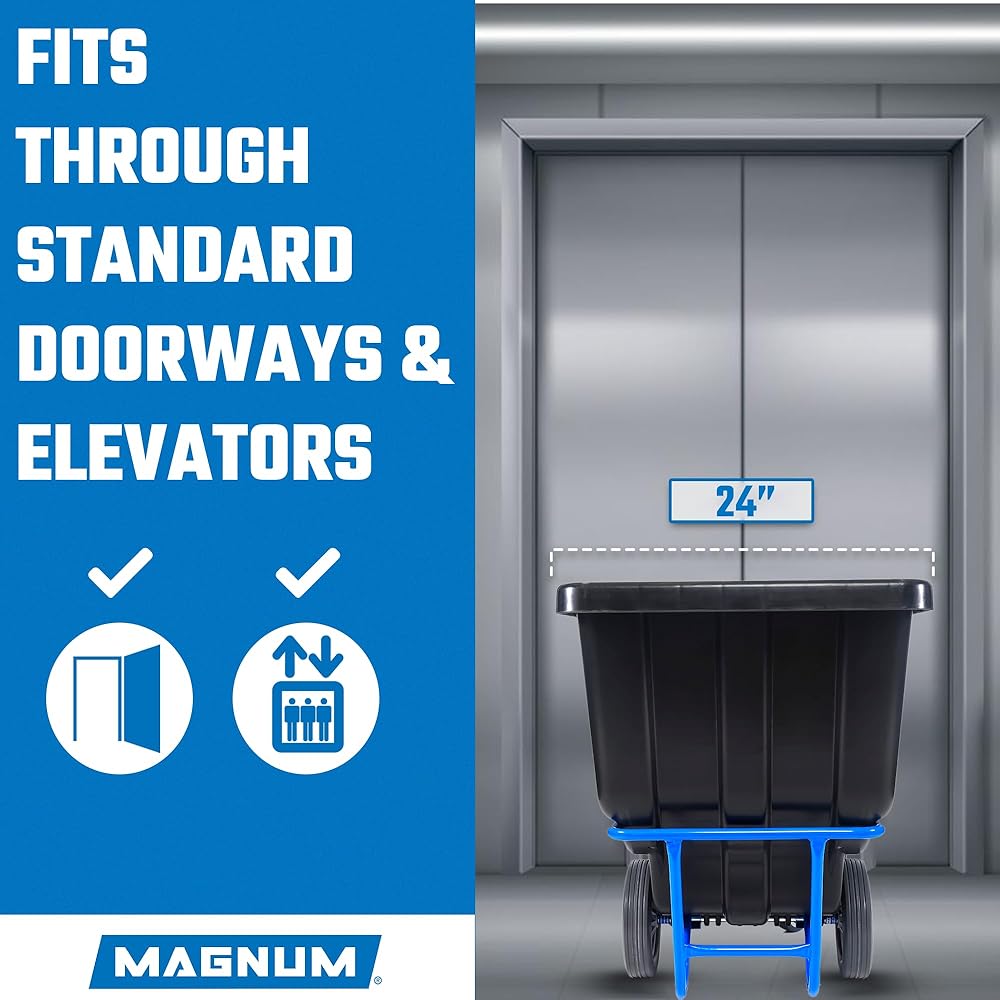 • NARROW PROFILE: Unlike other 850 pound capacity dump carts, this slim dump cart measures only 24” wide, allowing it to easily fit through standard doorways and maneuver with ease down hallways and elevators.
