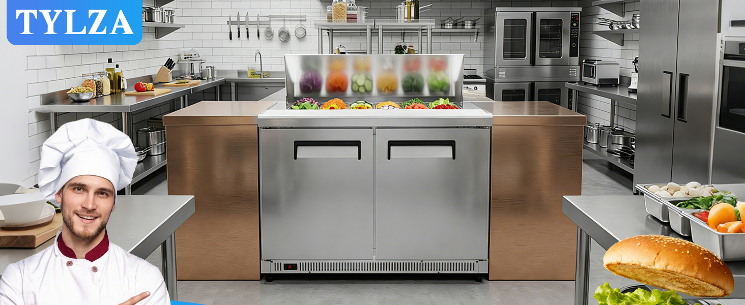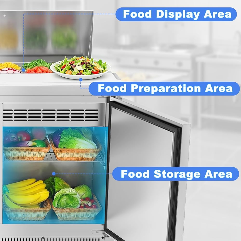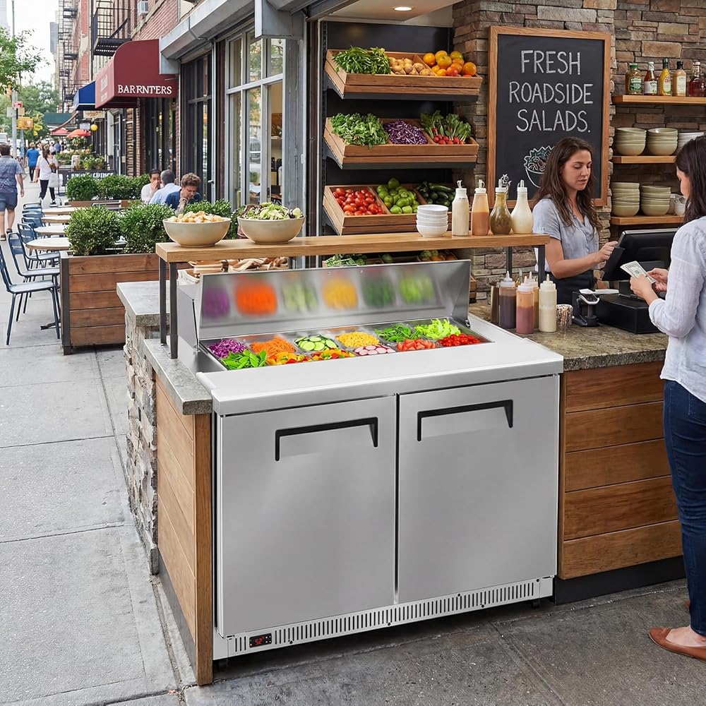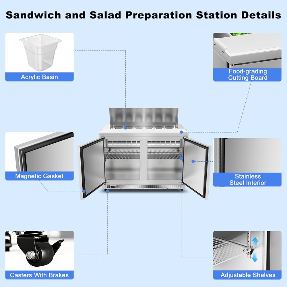 ثلاجة Tylza التجارية مقاس 48 بوصة، وطاولة إعداد سلطة الساندويتشات مقاس 12.7 قدمًا مكعبًا، وثلاجة سطح العمل الضخمة مع 12 مقلاة ولوح تقطيع، ومبرد إعداد السلطة من الفولاذ المقاوم للصدأ ببابين للمطعم وشاحنة الطعام