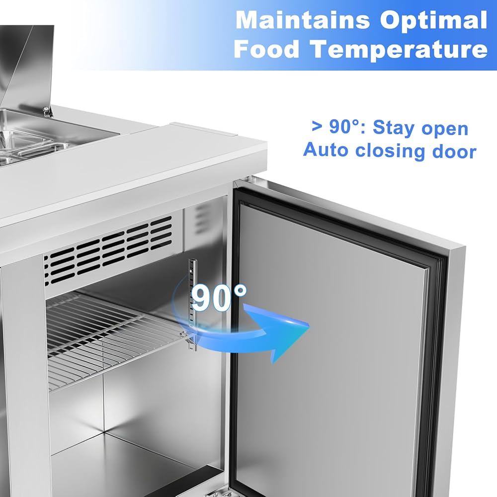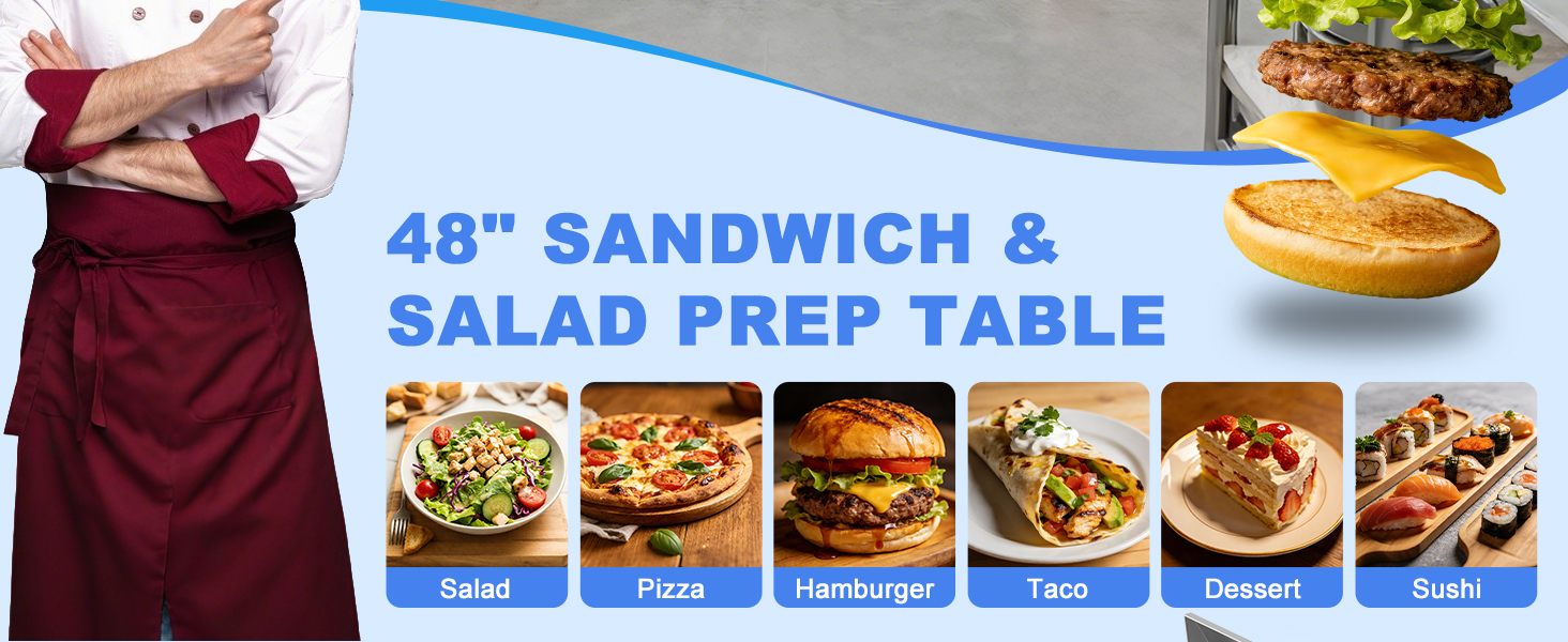 محطة عمل فسيحة مقاس 48 بوصة: قم بزيادة كفاءة الإعداد إلى أقصى حد من خلال سطح عمل مقاس 48 بوصة عرض × 9.6 بوصة عمق ومساحة تخزين تبلغ 12.7 قدمًا مكعبًا. تتضمن 12 مقلاة مخصصة للطعام ولوح تقطيع كبير، مما يمنح 1-2 طهاة مساحة واسعة للعمل دون ازدحام أثناء الاندفاع المزدحم