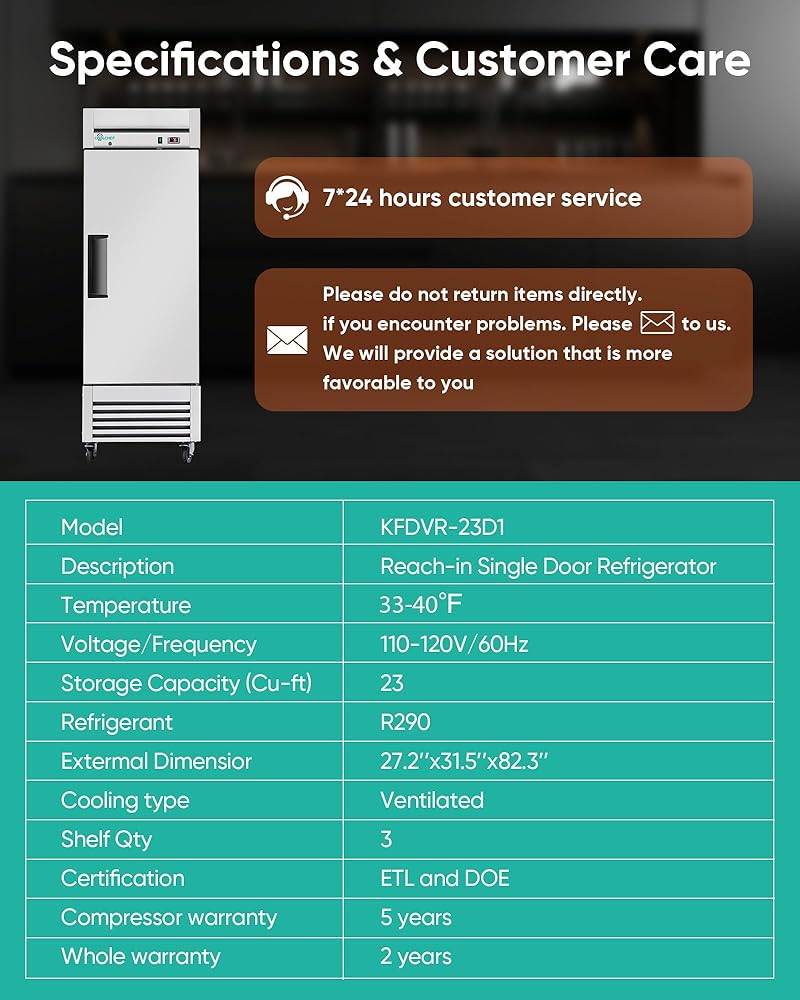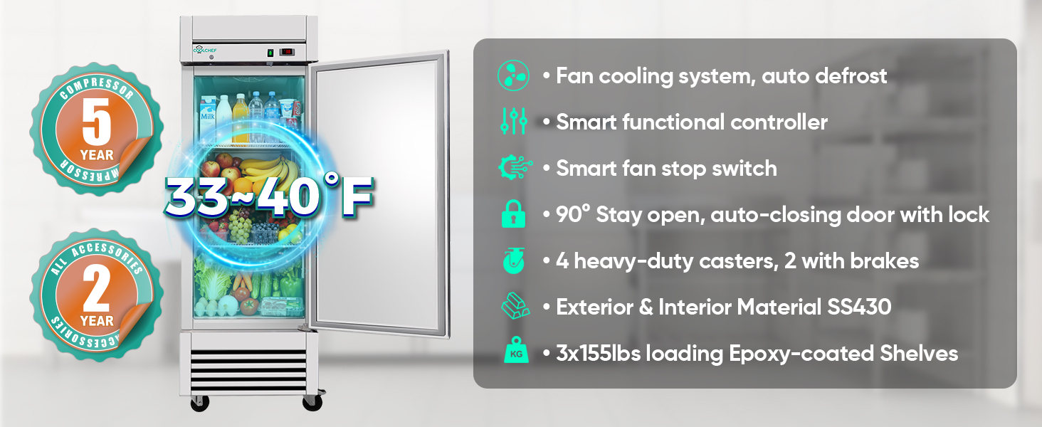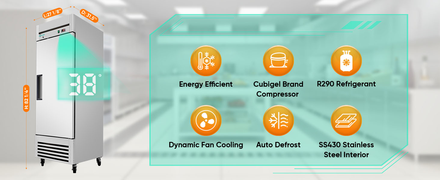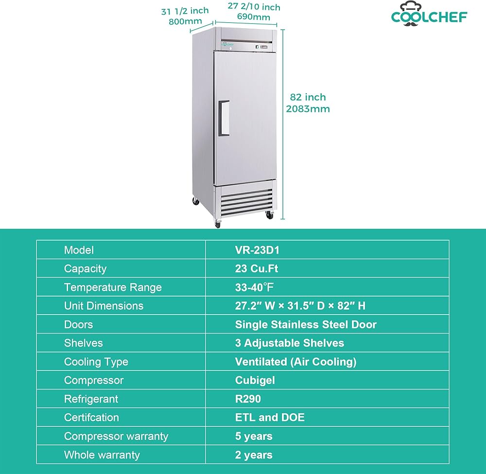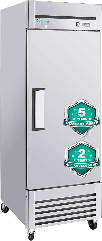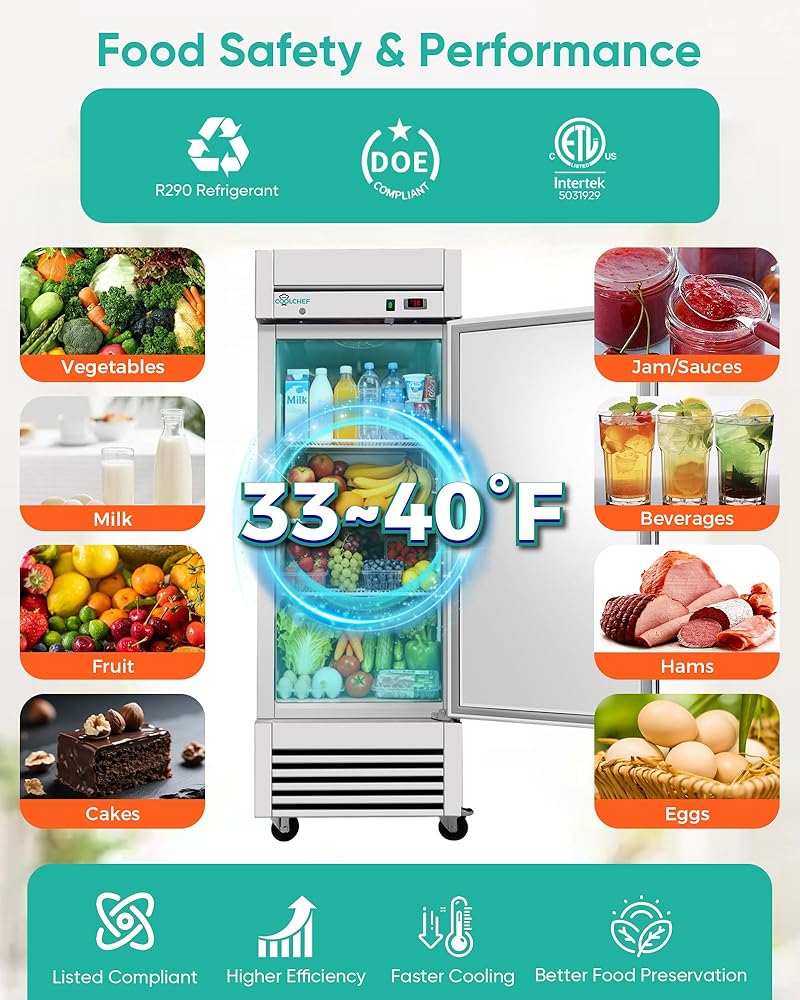 ثلاجة تجارية مقاس 27 بوصة، وثلاجة عمودية من الفولاذ المقاوم للصدأ سعة 23 قدمًا مكعبًا، ودرجة حرارة من 33 درجة فهرنهايت إلى 40 درجة فهرنهايت، و3 أرفف قابلة للتعديل