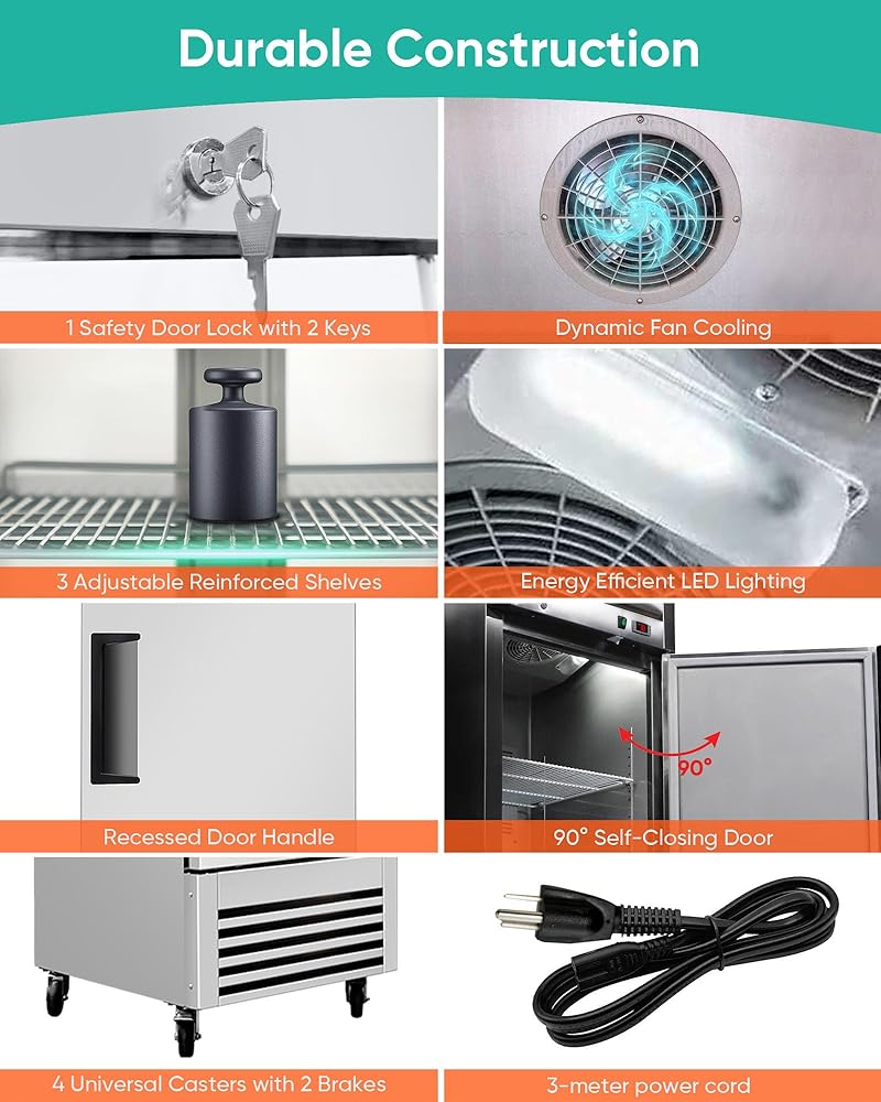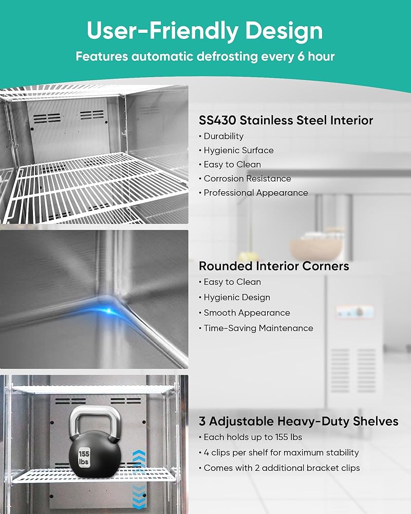 هيكل متين: مصنوع من الفولاذ المقاوم للصدأ SS430 من الداخل والخارج من أجل القوة وسهولة التنظيف. تتضمن زوايا مستديرة، و3 أرفف قابلة للتعديل مقاومة للتآكل (حمولة كل منها 155 رطلاً)، و4 عجلات مع فراملين، وإضاءة LED علوية، بالإضافة إلى مشبكين إضافيين.