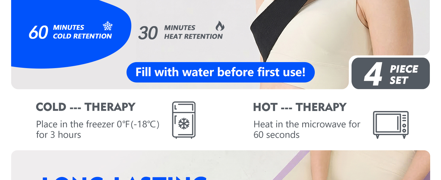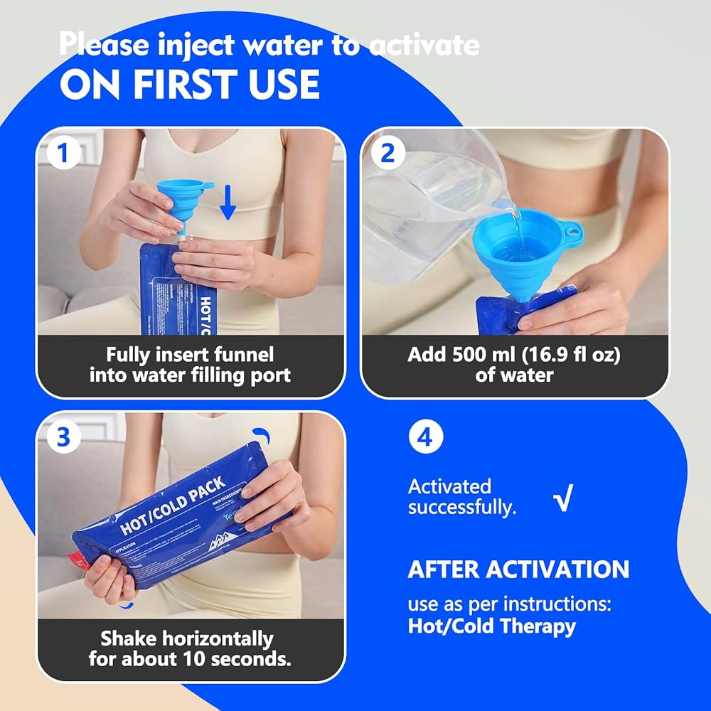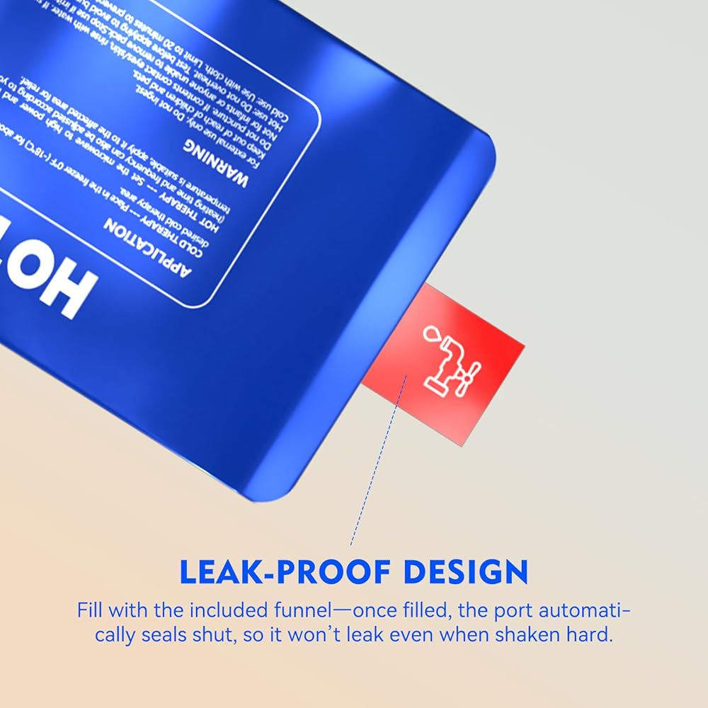 سهل الملء وإعادة الاستخدام - ما عليك سوى صب 500 مل (16.9 أونصة) من الماء في منفذ التعبئة، ثم قم بهزها لمدة 10 ثوانٍ تقريبًا، ثم قم بتجميدها لمدة 3 ساعات للعلاج البارد أو الميكروويف لمدة 60 ثانية تقريبًا للحرارة. تصميم تعبئة لمرة واحدة – عمليات إعادة استخدام متعددة
