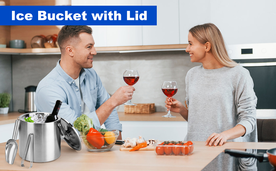 الملحقات: تأتي دلاء الثلج الخاصة بنا مع مجموعة كاملة من الملحقات، بما في ذلك ملقط الثلج، ومغرفة ذات مقابض قوية تجعل نقل الثلج سريعًا، بالإضافة إلى الغطاء المحكم المصنوع من الفولاذ المقاوم للصدأ يوفر عزلًا إضافيًا.