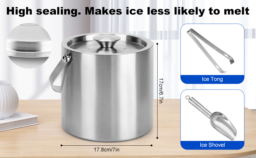 حافظ على الثلج مجمدًا لفترة أطول: يتميز دلو الثلج المعزول الخاص بنا بجدران مزدوجة وغطاء محكم من الفولاذ المقاوم للصدأ، والذي يمكنه الحفاظ على الثلج باردًا لفترة أطول، ودلاء الثلج مصنوعة من الفولاذ المقاوم للصدأ بالكامل (الطبقة الداخلية مصنوعة من الفولاذ المقاوم للصدأ بدرجة 304 للطعام).