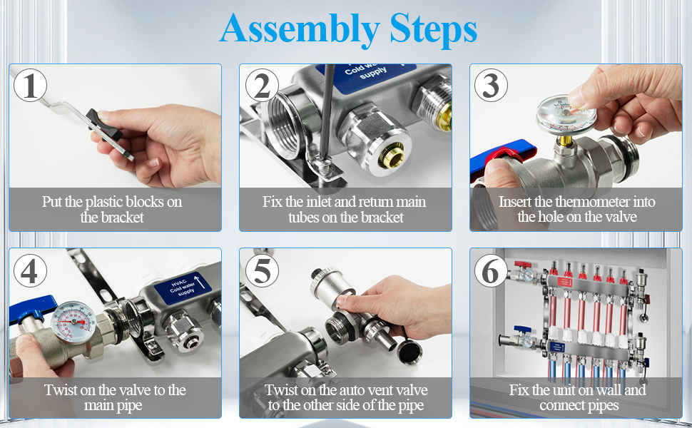 【سهلة التركيب】يتم تضمين دعامة تثبيت من الفولاذ المقاوم للصدأ شديدة التحمل مما يجعلها قابلة للتركيب على أي جدار بسهولة. لا حاجة إلى أدوات PEX، فقط استخدم كماشة عادية أو مفتاح ربط قابل للتعديل لتوصيل أنابيب PEX بالمشعب. تم اختبار الضغط وتم تجميعه مسبقًا. ما عليك سوى تركيب المشعب على الأقواس وتوصيل الصمامات وأنابيب PEX.