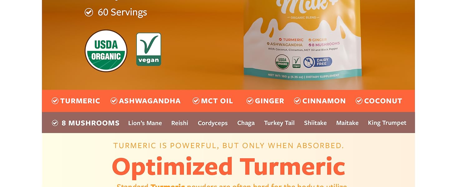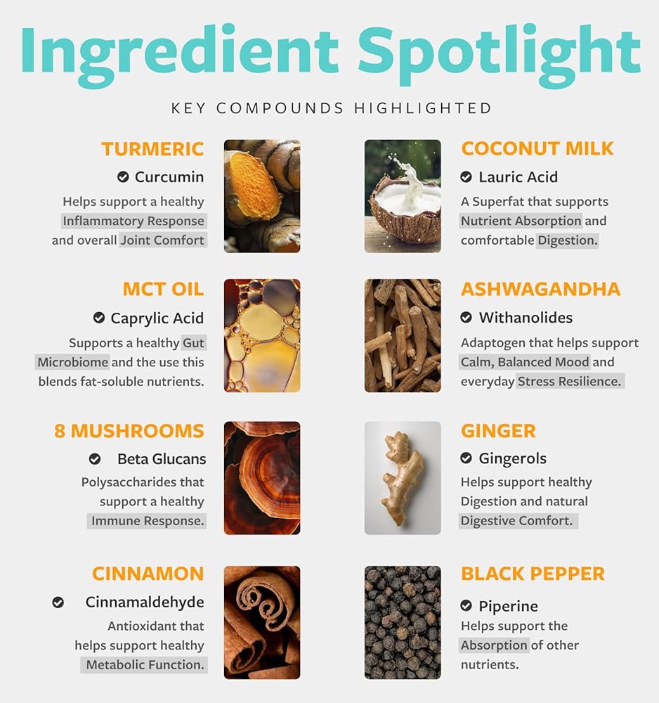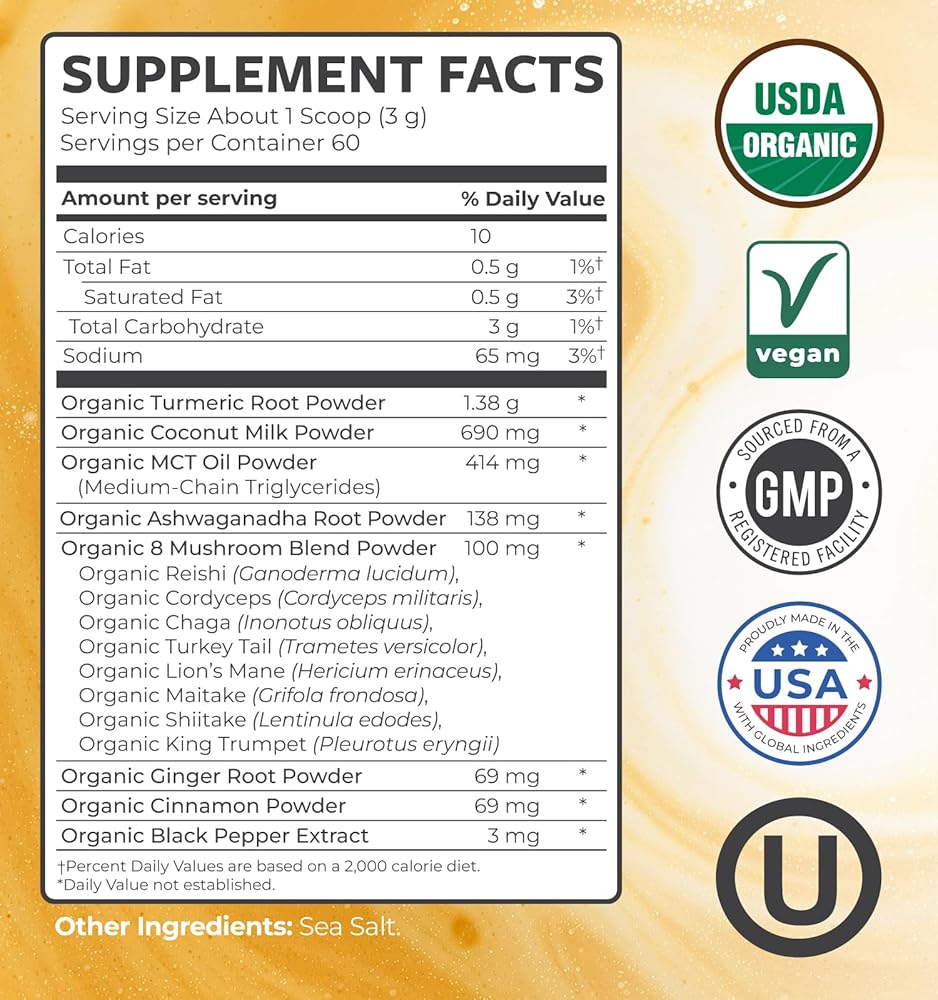 قوة فعالة نقية: الآن يمكنك تجربة جميع فوائد الأعشاب المتكيفة مع الحليب الذهبي العضوي التابع لوزارة الزراعة الأمريكية مع الكركم والزنجبيل المليء بالمركبات النشطة بيولوجيًا المعززة للعافية.