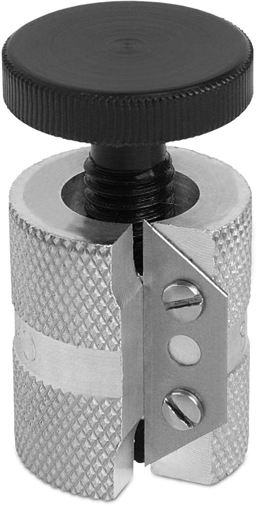 Mushroom Grazer Use – Looking through the slot where the blade makes contact with the cue tip set the mushroom grazer on top of your cue's shaft adjusting the plastic knob up or down so that the blade will only have contact with the cue tip and not with your ferrule. After turning the knob to set the appropriate depth so that only the tip meets with the blade hold your cue's shaft steadily in one hand and push the mushroom grazer down on the cue tip in the other hand. Looking through the opening