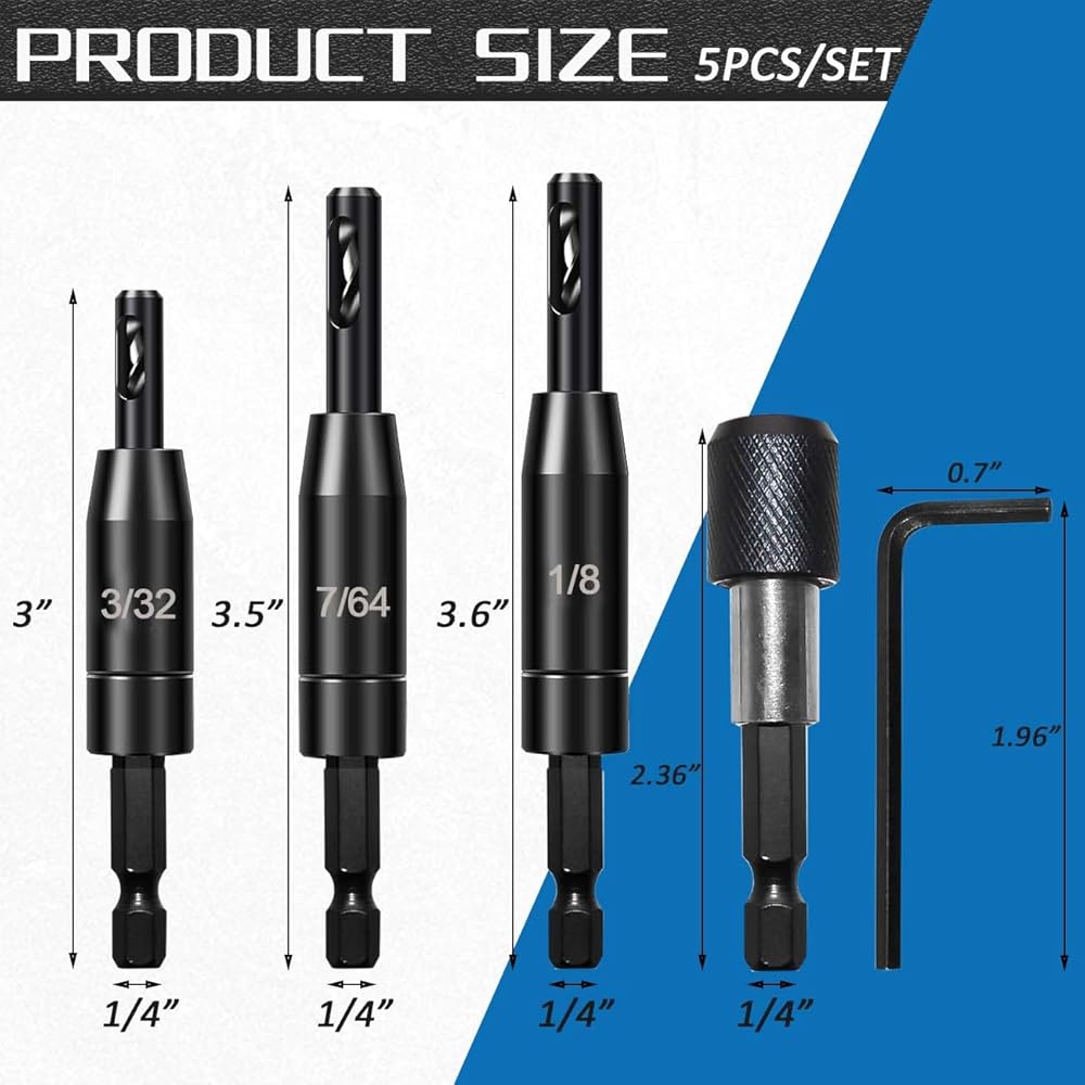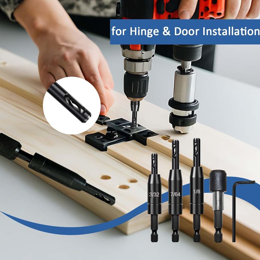 Package Includes : Total 5pcs. Hinge drills come in 3 different sizes 3/32", 7/64", and 1/8", 1pc quick change bit holder,1pc hex key