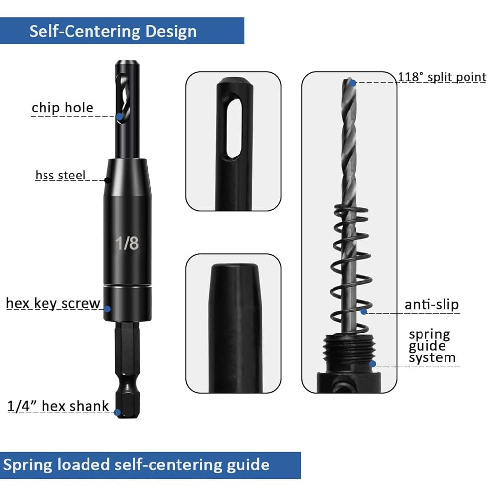 High-quality Materials : Made of high-speed steel, enhances high-pressure resistance, maintains sharpness, drills faster, and lasts longer,Self-Centering design ensures precise drilling, while the highly spring-loaded mechanism securely holds the bits in place