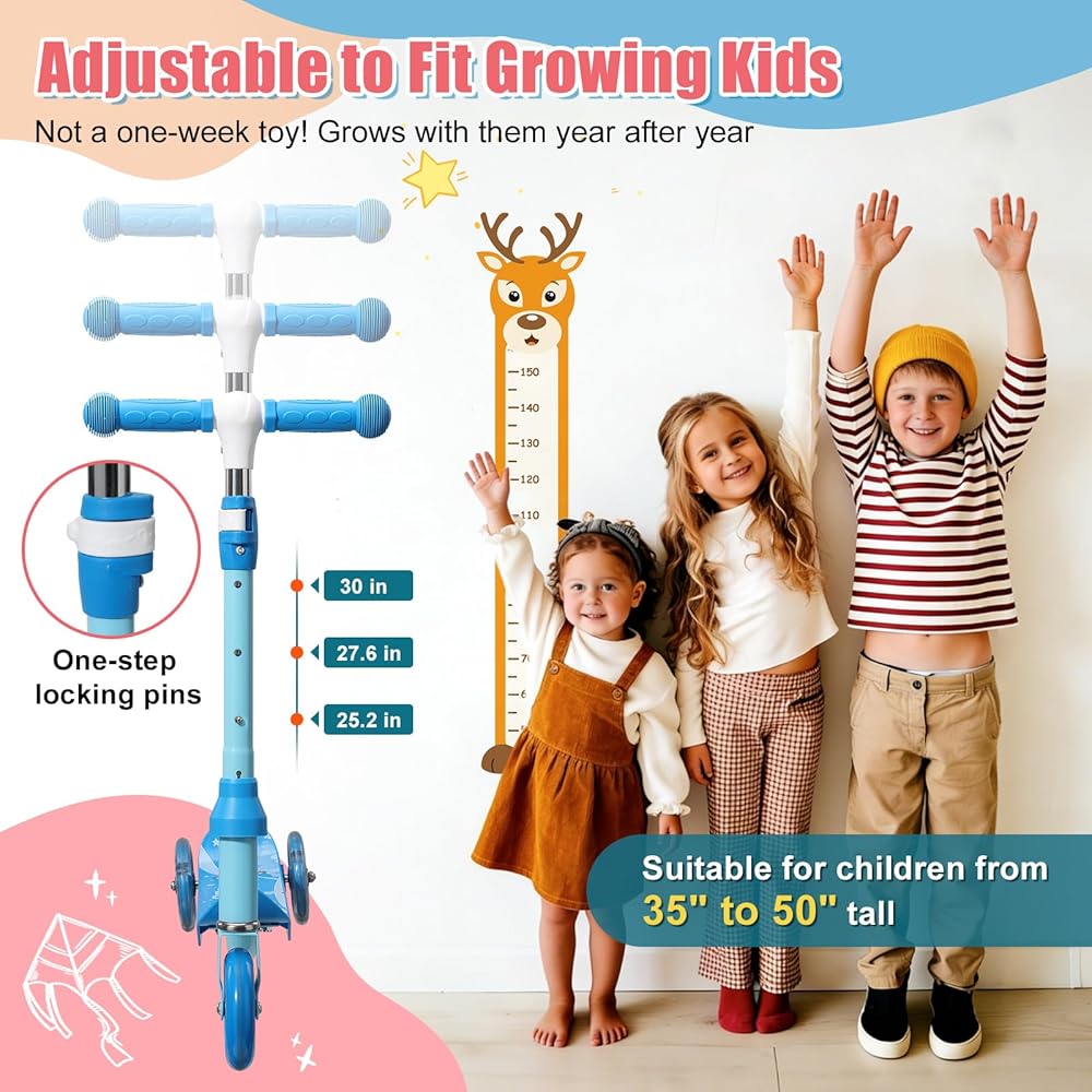 ينمو معهم (الأعمار من 3 إلى 7 سنوات، 3 إعدادات للارتفاع) - اضبط شريط T إلى 25.2 بوصة / 27.6 بوصة / 30 بوصة (يوصى بطول 35 بوصة - 50 بوصة). تساعد أداة الضبط المغطاة والسلسة على حماية المفصل وتبقي الأيدي الصغيرة أكثر راحة.