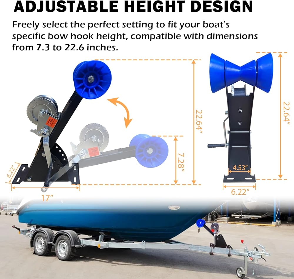 Adjustable Height for Flexible UseThe winch stand's roller height is easily adjustable from 7 to 22.5 inches (measured from the center of the roller to the trailer frame) by simply manipulating the included screws, allowing you to customize setup for various boat sizes