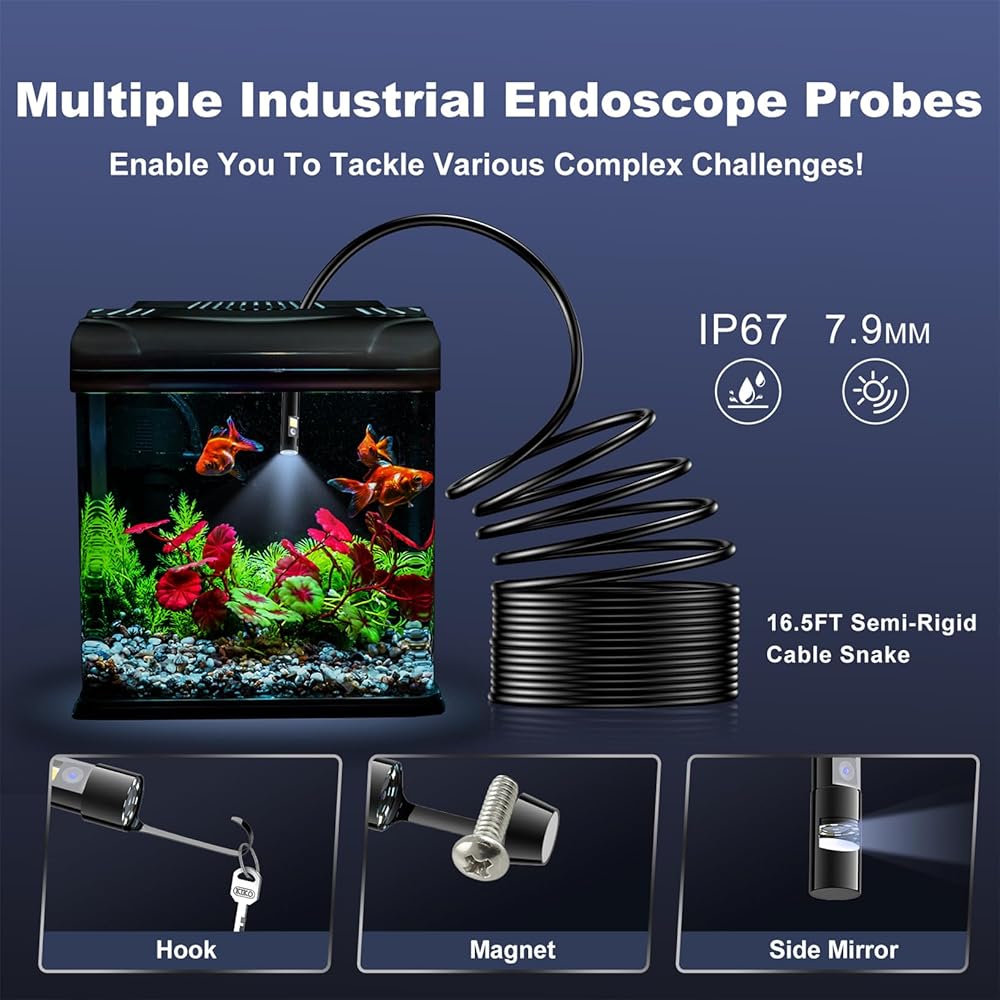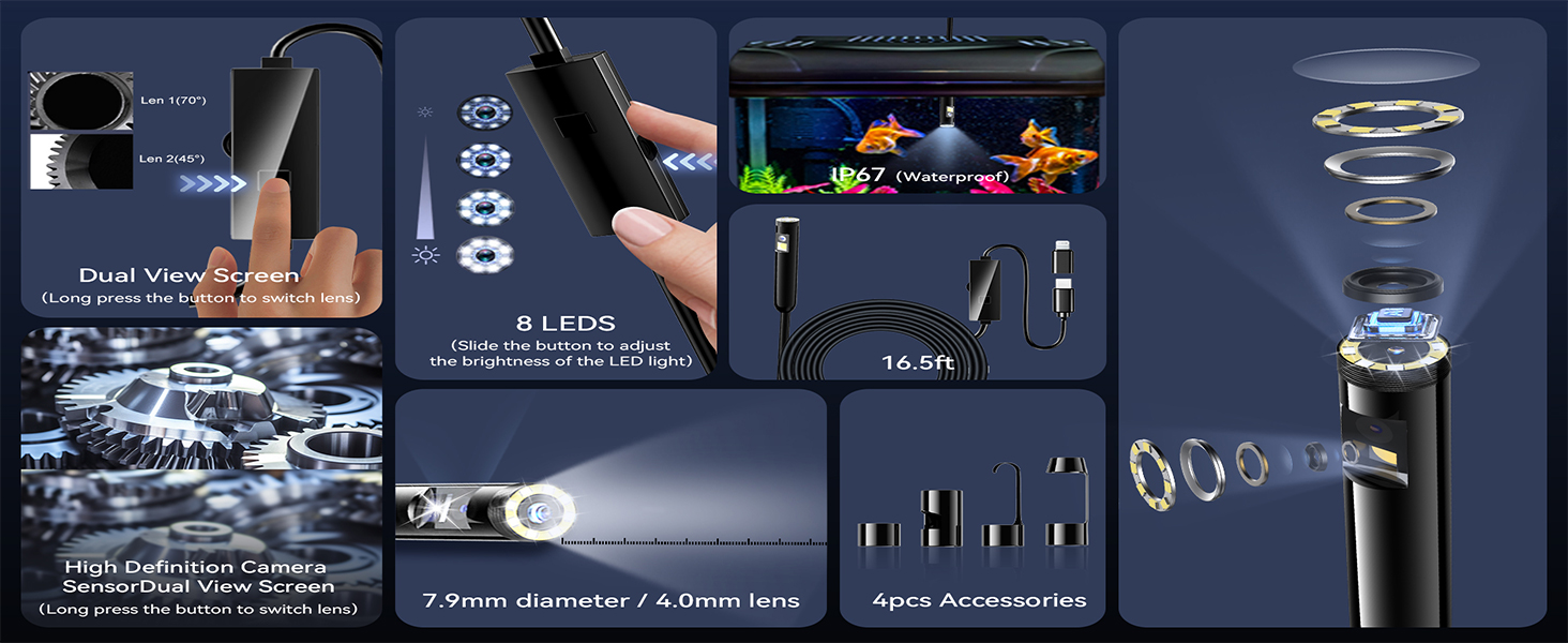 كاميرا فحص مزدوجة العدسات بدقة 1920 بكسل: تلتقط كاميرا الفحص صورًا واضحة بدقة 2.0 ميجابكسل ومقاطع فيديو عالية الدقة بدقة 1920 بكسل. اضغط لفترة طويلة لتبديل العدسات لمشاهدة أفضل. يمكن لأضواء LED السبعة القابلة للتعديل والسطوع القابل للتعديل أن تواجه البيئات الخافتة بسهولة. كاميرا المنظار قابلة للتوصيل والتشغيل ولا تتطلب متاعب الشحن. يمكن للكاميرا مقاس 7.9 ملم التعامل بسهولة مع الفجوات الصغيرة وحل المشكلات المختلفة. أدوات رائعة للرجال