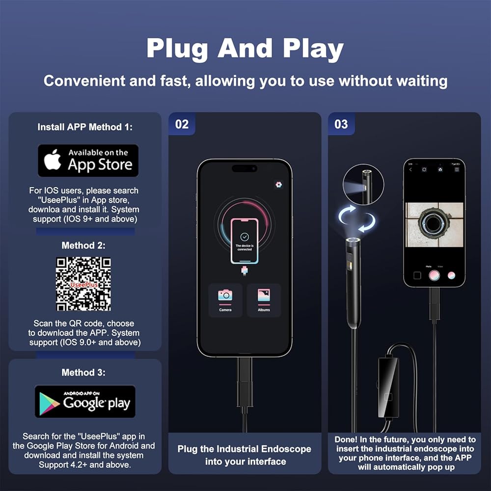 【كاميرا Borescope مع اتصال سهل بالضوء】: يمكن توصيل كاميرا الفحص Borescope هذه بسهولة وسرعة بأجهزة Ios 9.0+/C من خلال واجهة. عند استخدامه لأول مرة، ستظهر رسالة مطالبة بتنزيل البرنامج تلقائيًا. إذا لم تظهر رسالة التنزيل، فيرجى البحث عن "Useeplus" في متجر التطبيقات أو مسح التعليمات الموجودة في دليل Qr Code لتنزيل التطبيق. مع عمليات بسيطة، يمكنك عرض الصور في الوقت الحقيقي على الشاشة