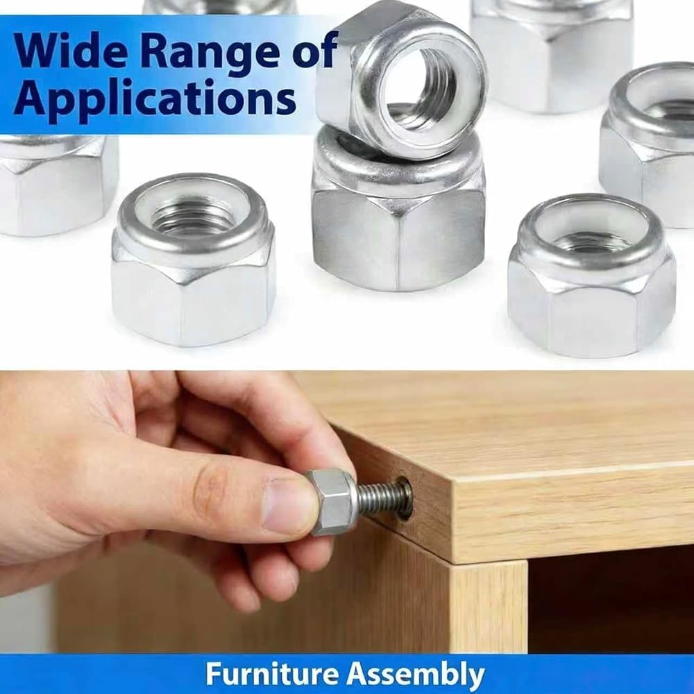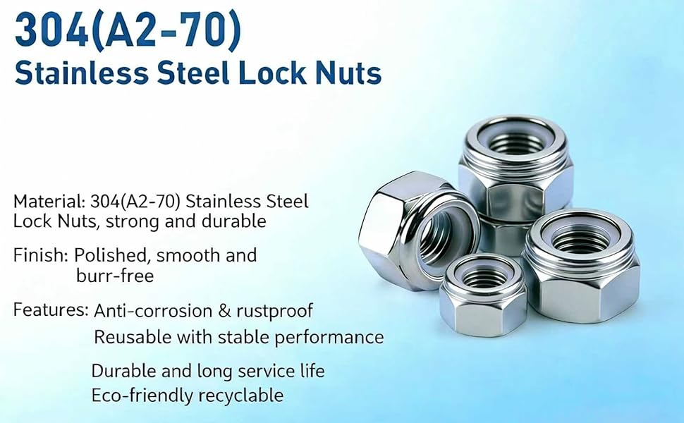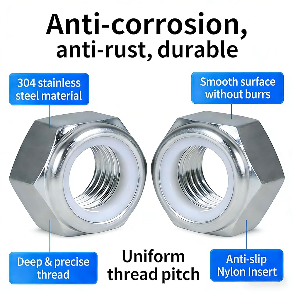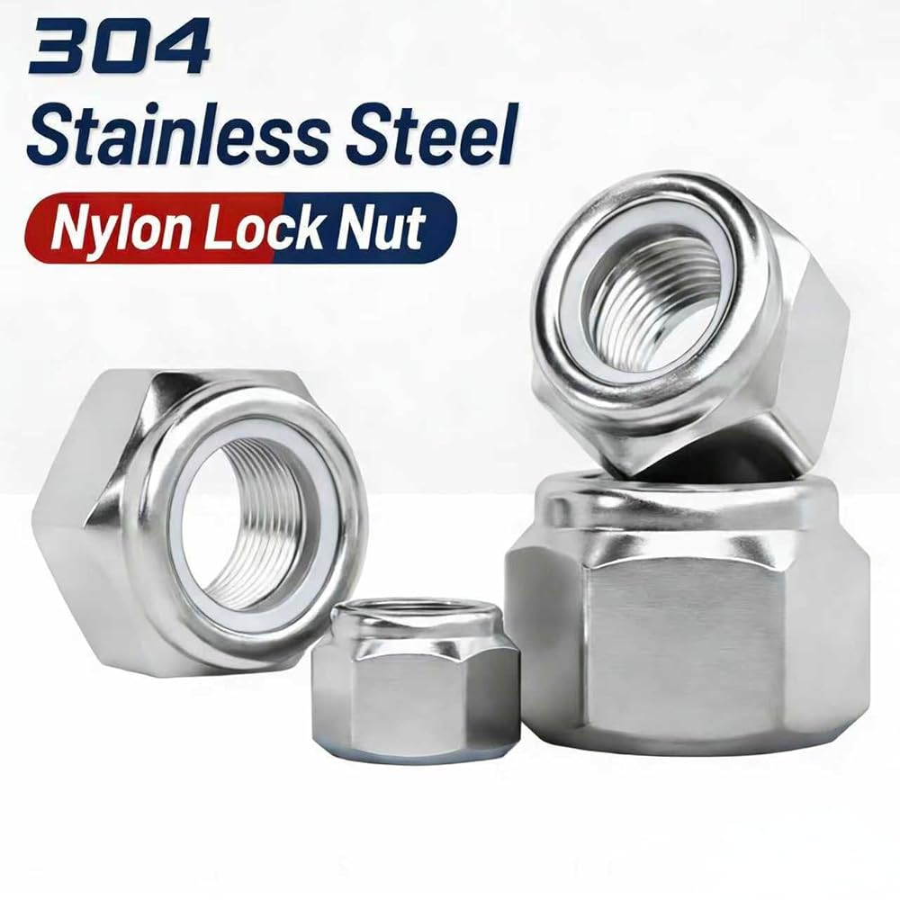 • صواميل قفل من الفولاذ المقاوم للصدأ 304 (SAE): تم تصميم كل صامولة قفل من النايلون من الفولاذ المقاوم للصدأ 304 (18-8) الفاخر، مما يوفر خصائص فائقة مقاومة للصدأ والتآكل لمتانة طويلة الأمد. يمنع طوق النايلون المصمم بدقة بشكل فعال الارتخاء ويقاوم الاهتزاز، مما يضمن تثبيتًا آمنًا وموثوقًا في التطبيقات الديناميكية. تتميز بأنماط حلزونية واضحة ولمسة نهائية مصقولة وناعمة، كل صامولة خالية من نتوءات أو حواف حادة من أجل التعامل الآمن والمريح دون القلق من خدش يديك.