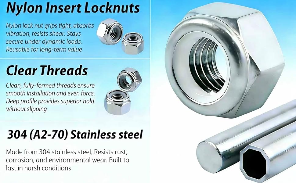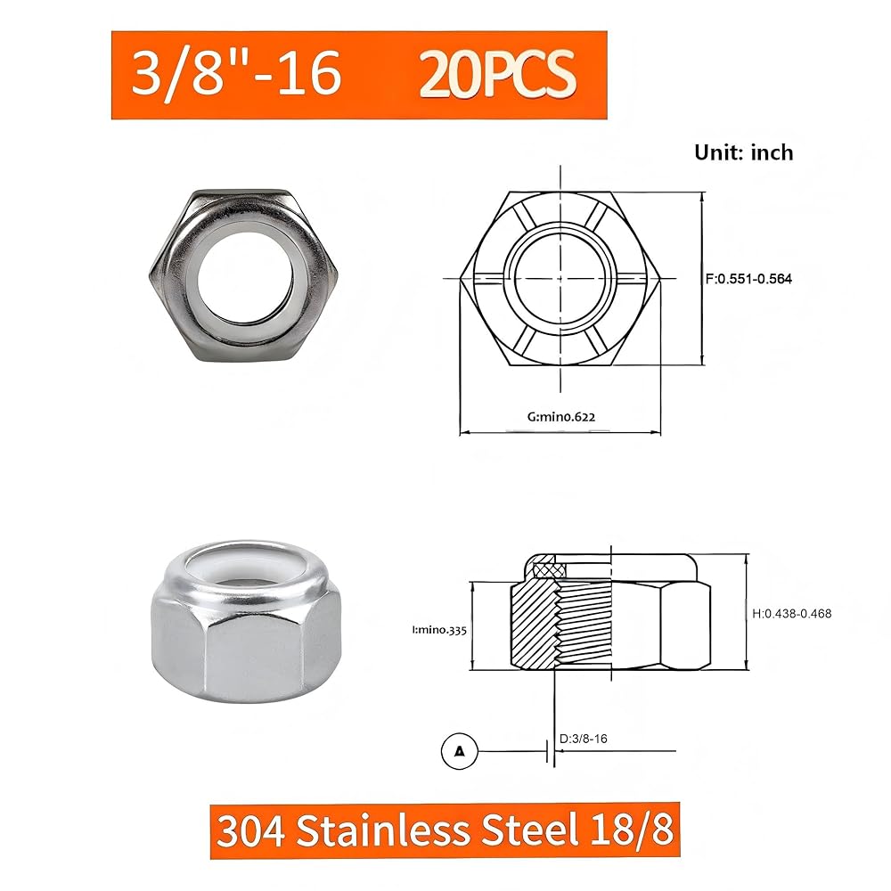 • الكمية والحجم: 20 قطعة 3/8"-16 صواميل قفل بخيط SAE - 304 (18-8) من الفولاذ المقاوم للصدأ مع صواميل قفل من النايلون