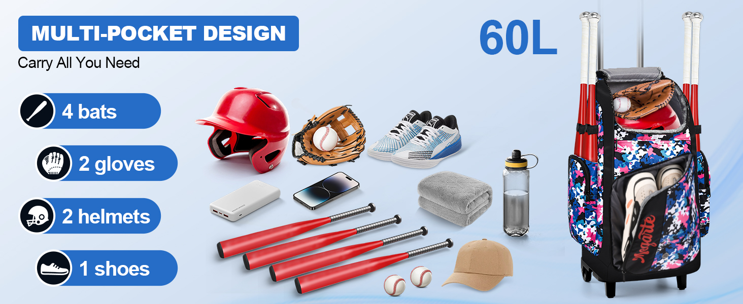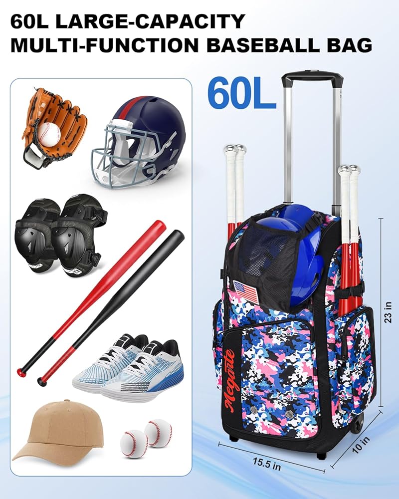 ⚾[سعة إضافية 60 لترًا] - تتميز حقيبة البيسبول هذه بسعة 60 لترًا بحجم مطور يبلغ 25 × 15.5 × 10.5 بوصة، مما يوفر مساحة واسعة لخوذتك والقفازات والملابس ومعدات اللعبة. تحمل ما يصل إلى 4 مضارب وتعمل بشكل مثالي كحقيبة بيسبول للشباب، أو حقيبة كرة لينة، أو حقيبة تدريب يومية.