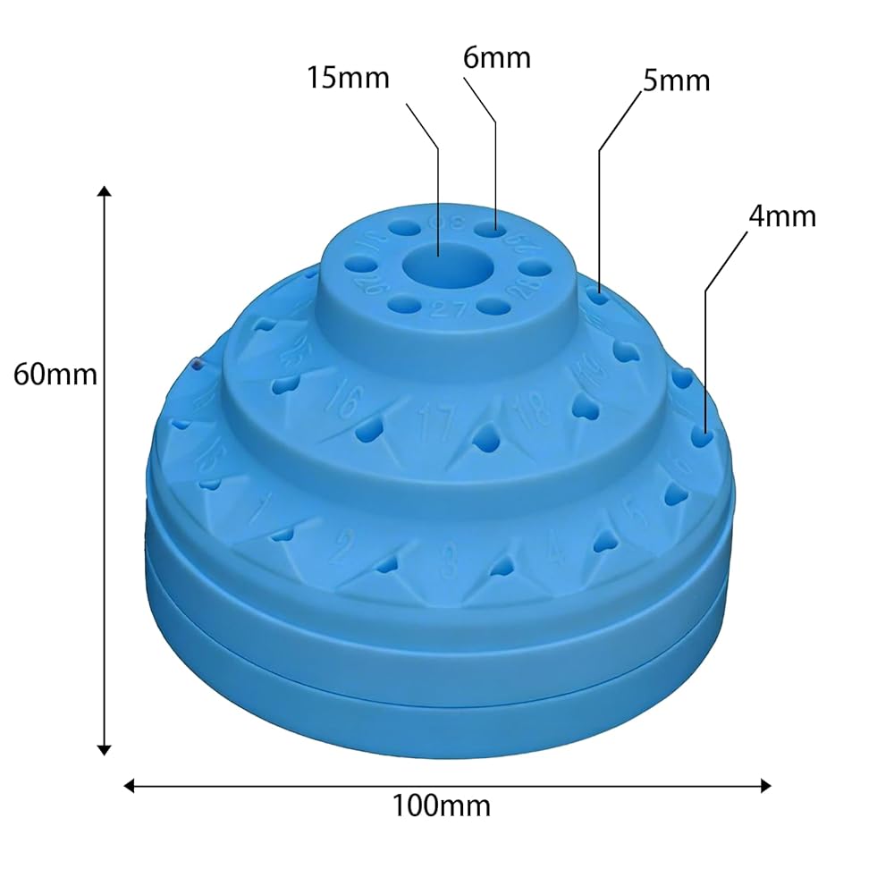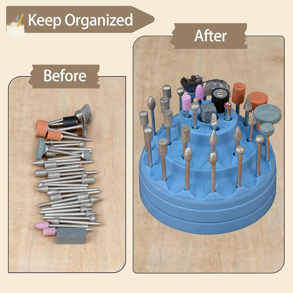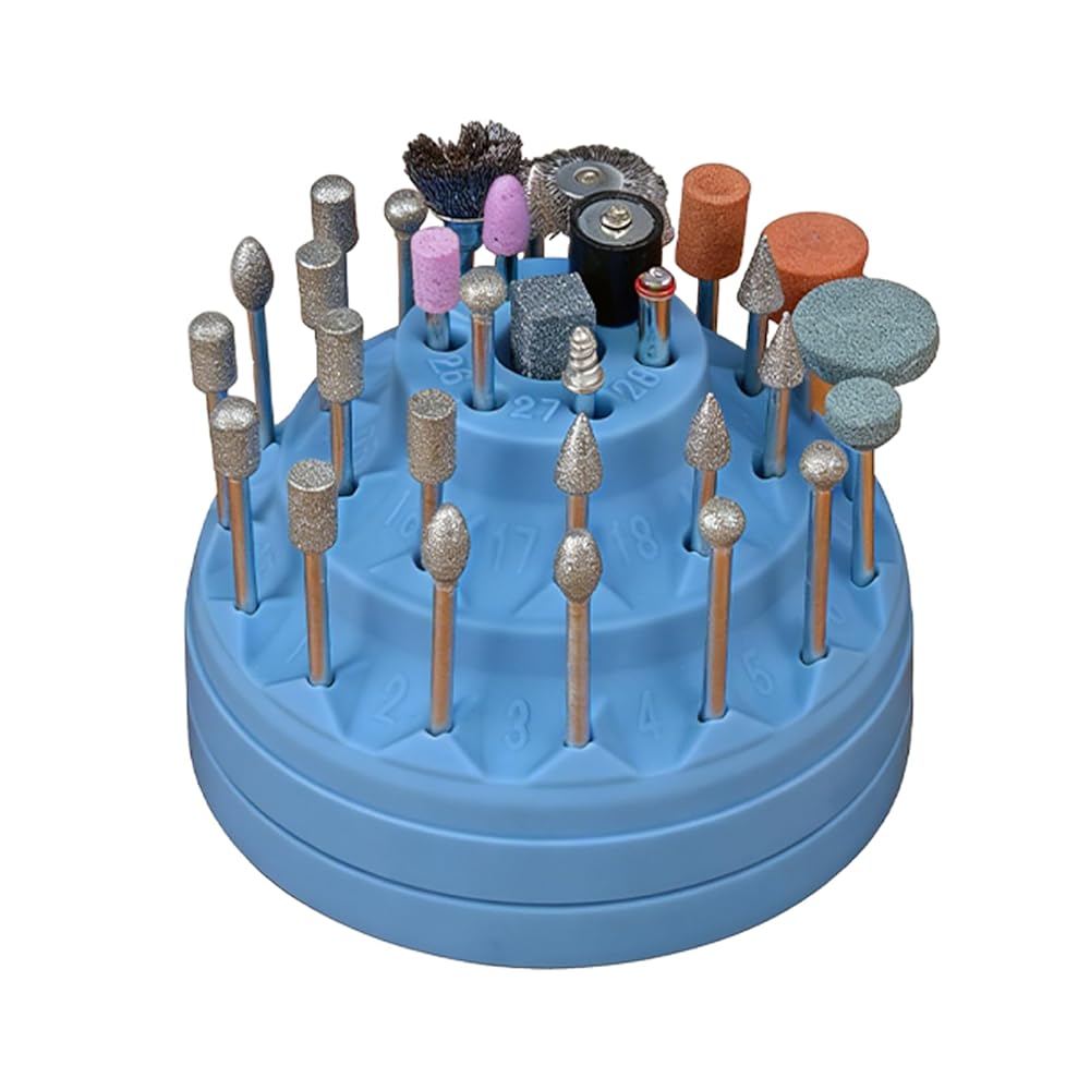 31 فتحة في 3 أحجام للتخزين المنظم: مصممة خصيصًا لقطع الأدوات الدوارة. تأتي الفتحات الدقيقة الـ 31 بثلاثة أقطار مختلفة (4 مم، 5 مم، 6 مم)، لذا يمكن لكل من قطع النحت الكبيرة والصغيرة أن تقف في وضع مستقيم دون لمس بعضها البعض. يحافظ على قطعك محمية ومنضدة العمل الخاصة بك مرتبة.