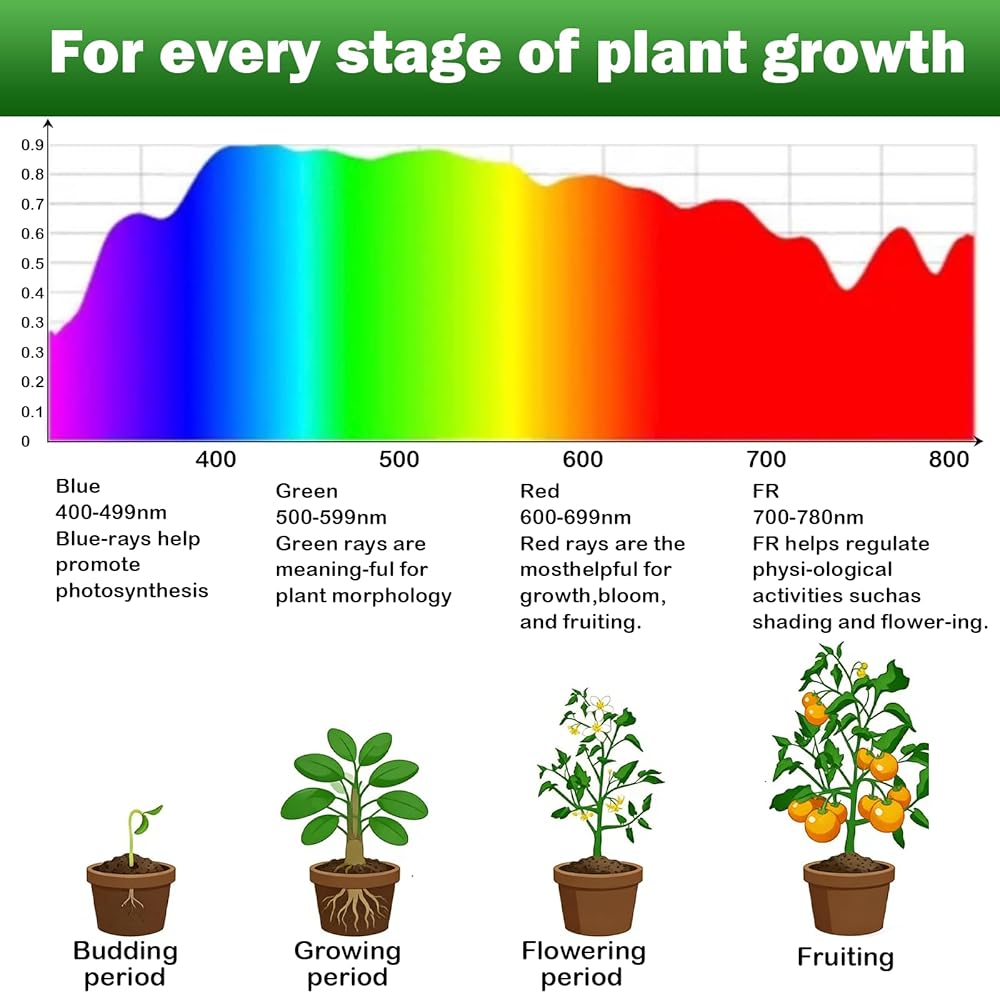 【Versatile Applications】 This plant grow lights indoor is ideal. Whether it's vegetables requiring prolonged strong light (such as tomatoes, lettuce, and cucumbers), flowers with specific requirements for light intensity and duration (such as roses, orchids, and succulents), or indoor green plants needing supplemental lighting to promote growth (such as pothos and monstera), the light can meet their growth needs by adjusting the lamp's angle, light intensity, and duration.