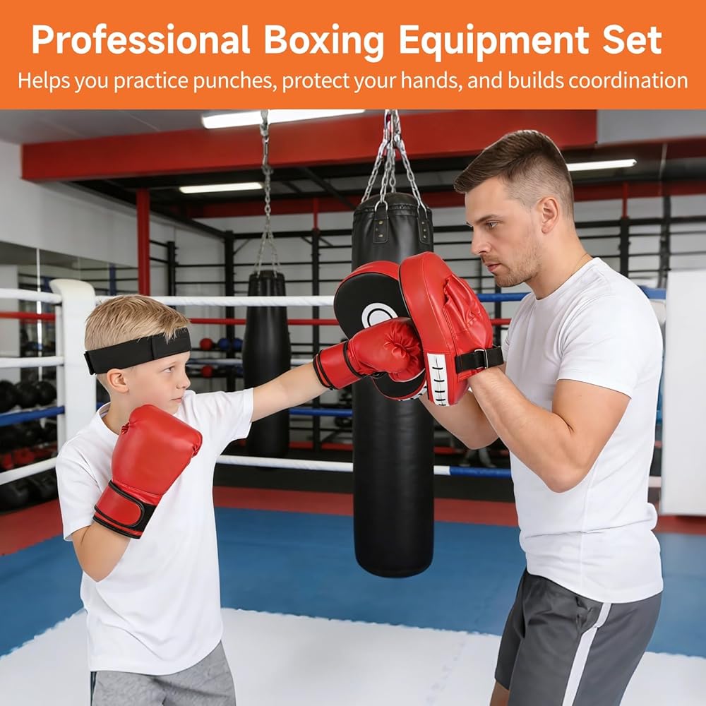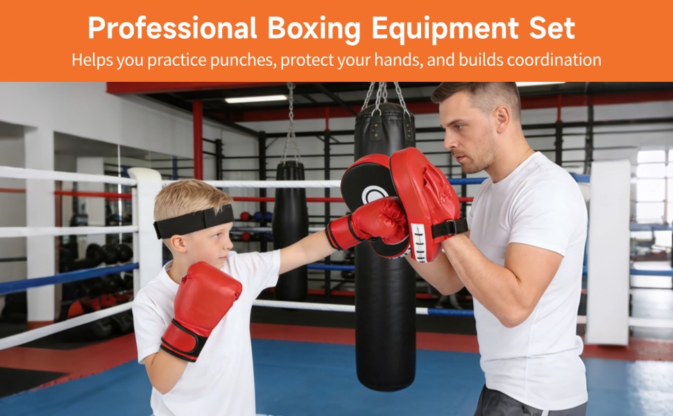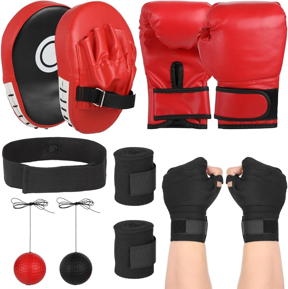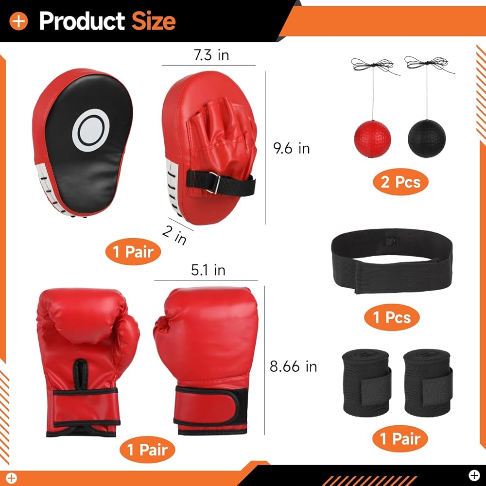 مجموعة معدات الملاكمة مع قفازات الملاكمة، قفازات اللكم، كرة رد فعل الملاكمة، واقيات اليد، عصابة رأس قابلة للتعديل، قفازات ملاكمة للرياضيين الشباب بتصميم اللهب للملاكمة، الفنون القتالية المختلطة، التدريب على الفنون القتالية