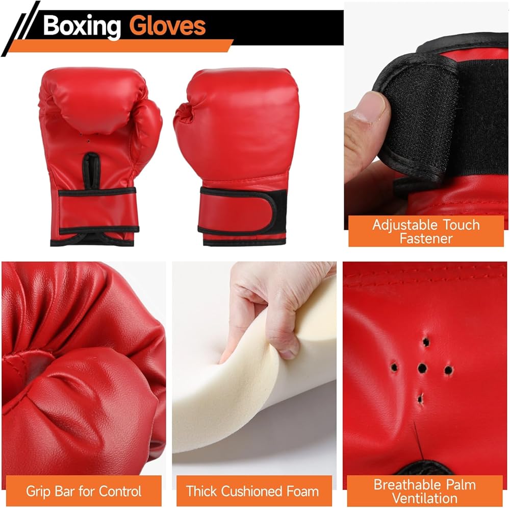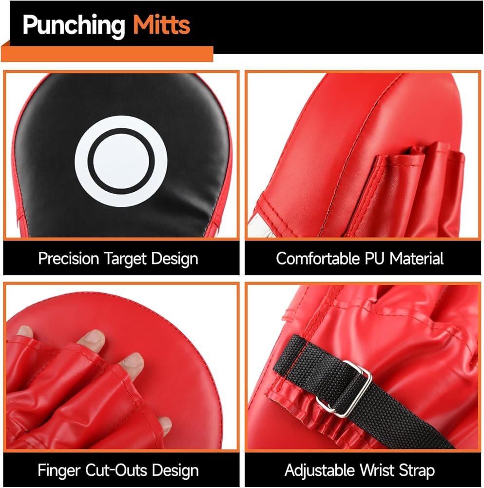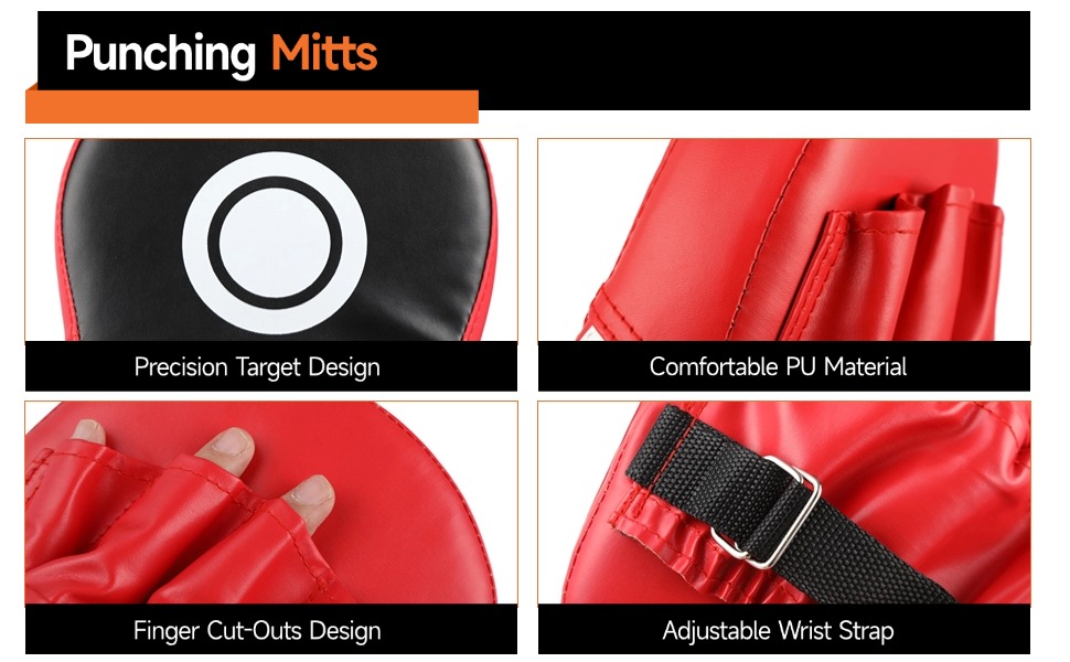 قفازات اللكم طويلة الأمد: مصنوعة من جلد البولي يوريثان المقاوم للاهتراء لمرونة دائمة، تتميز هذه القفازات بوسادة إسفنجية مبطنة توفر امتصاصًا فائقًا للصدمات، كل ذلك ضمن تصميم مدمج مقاس 9.6 × 7.3 × 2 بوصة لتعزيز الحماية والتحكم