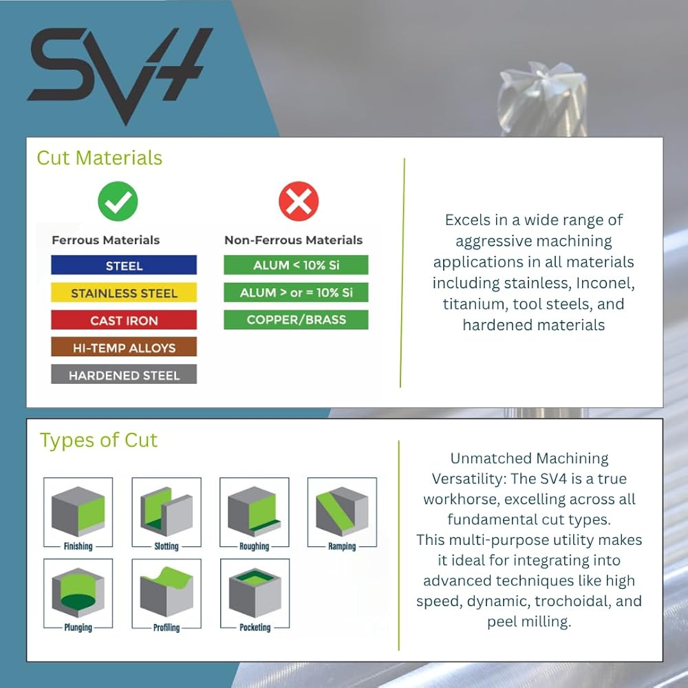 • HIGH QUALITY MATERIALS: SV4 end mills are manufactured with certified, premium, sub-micron grain carbide from trusted sources.