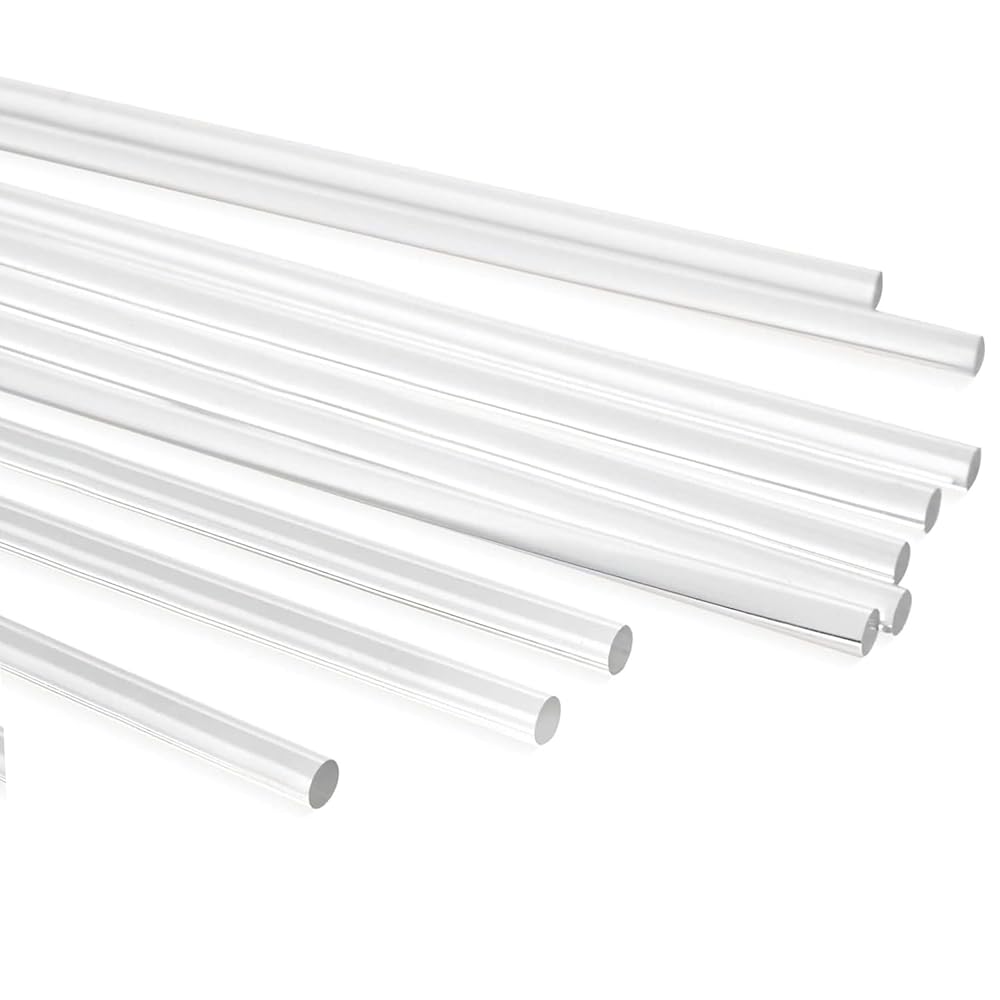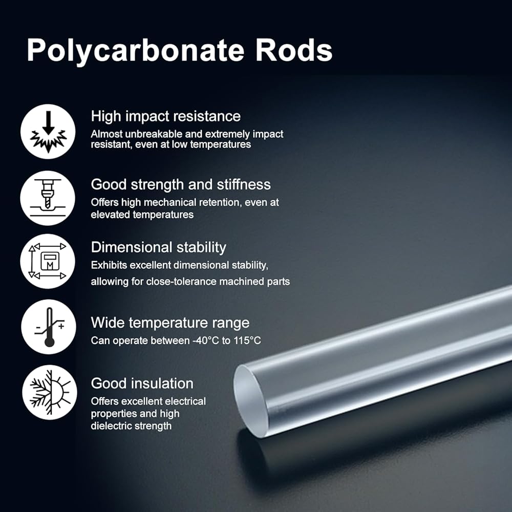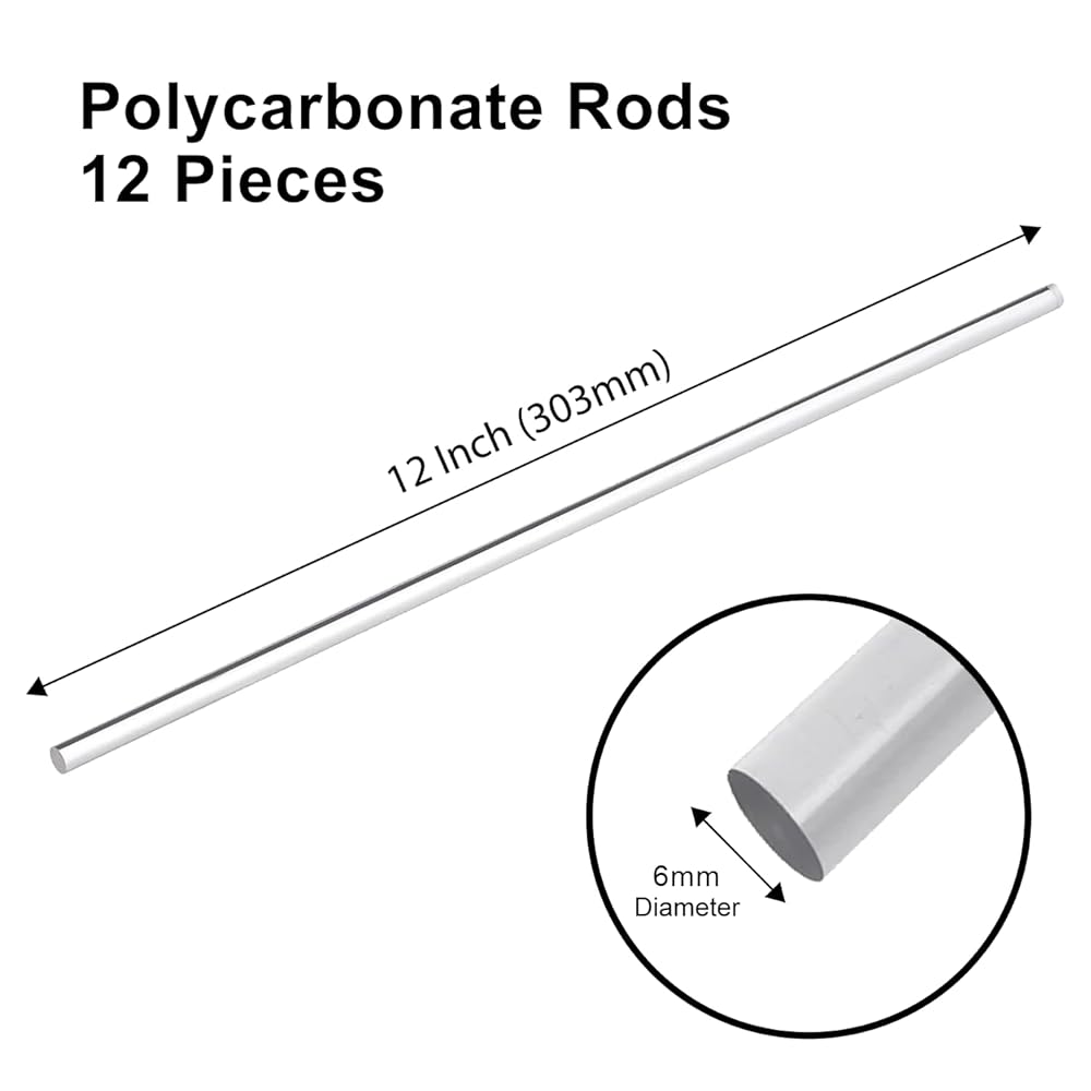 【MATERIAL】: High-performance clear PC (Polycarbonate Rods) with excellent impact resistance, electrical properties, and dimensional stability. 【QUALITY】: Strong, lightweight, flexible, and durable. High quality engineering plastic rods made from machine-grade polycarbonate resin. 【DIMENSION & PACKAGING】: Ten pieces of 6mm diameter transparent polycarbonate round rods, each 12 inch (305mm) in length. 【USAGE】: Commonly used for electrical insulators, medical devices, LED light guides, gears, and automotive components. They are also ideal for prototyping, 3D printing, and structural applications requiring impact resistance and transparency. 【Details】: Perfect alternative to heavier, less resilient materials such as glass. Good machinability, and low water absorbtion, with high heat resistance compared to standard plastics (-40°F to 270°F).