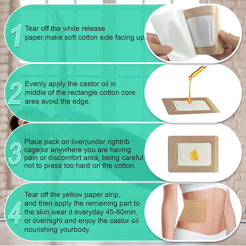 سهلة الاستخدام: تتميز أغلفة زيت الخروع الخاصة بنا بأنها سهلة الاستخدام للغاية، كل ما عليك فعله هو إزالة الورقة البيضاء ووضع بضع ملاعق من الزيت. لف زيت الخروع على البطن أو الكبد، ثم اضغط عليه برفق، ثم قم بتغطيته بمصدر للحرارة لمدة ساعة حتى يمتص.