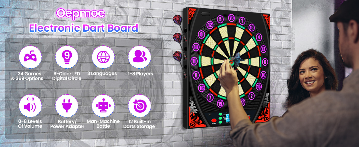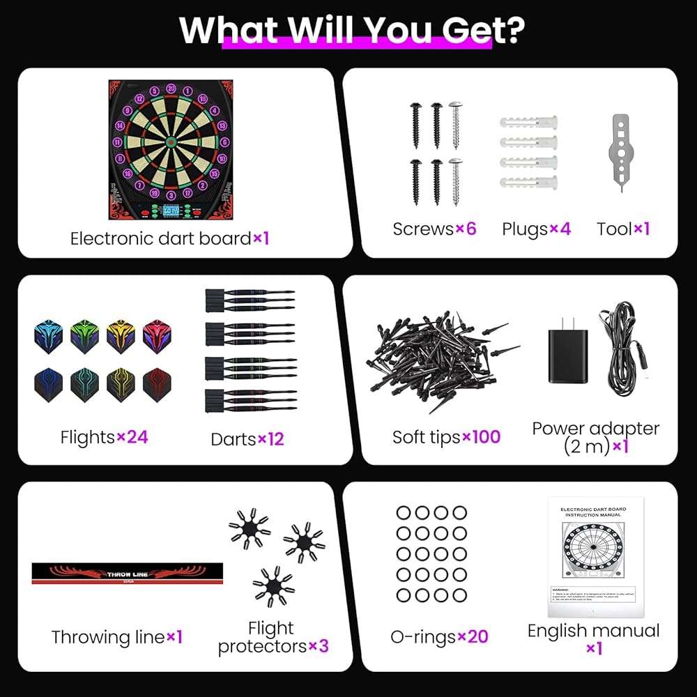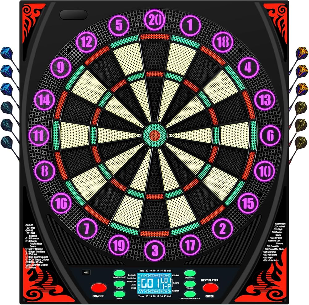 لوحات رمي السهام الإلكترونية للبالغين: توفر لوحة رمي السهام الإلكترونية 34 لعبة و369 خيارًا (بما في ذلك 301، والكريكيت، وRound The Clock، وHigh Score). لوحة رمي السهام الكهربائية تدعم ما يصل إلى 8 لاعبين في وقت واحد. يمكنك إعداد مشغل إلكتروني والاختيار من بين 5 مستويات صعوبة: مبتدئ ومتوسط ومتقدم وخبير ومحترف. بعد المباراة، اضغط على زر "اللاعب" لعرض متوسط نقاط كل لاعب وأداء رميه. إنه خيار رائع للعب غير الرسمي والتنافسي على حدٍ سواء